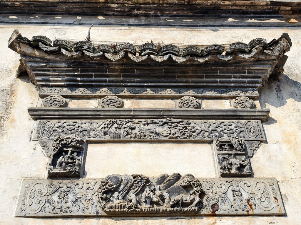 最值得一看的中院住宅,大门门罩石雕镂刻西周时期“周文王访贤”的故事,可惜的是石雕人物在“文革”中被毁掉了头部。