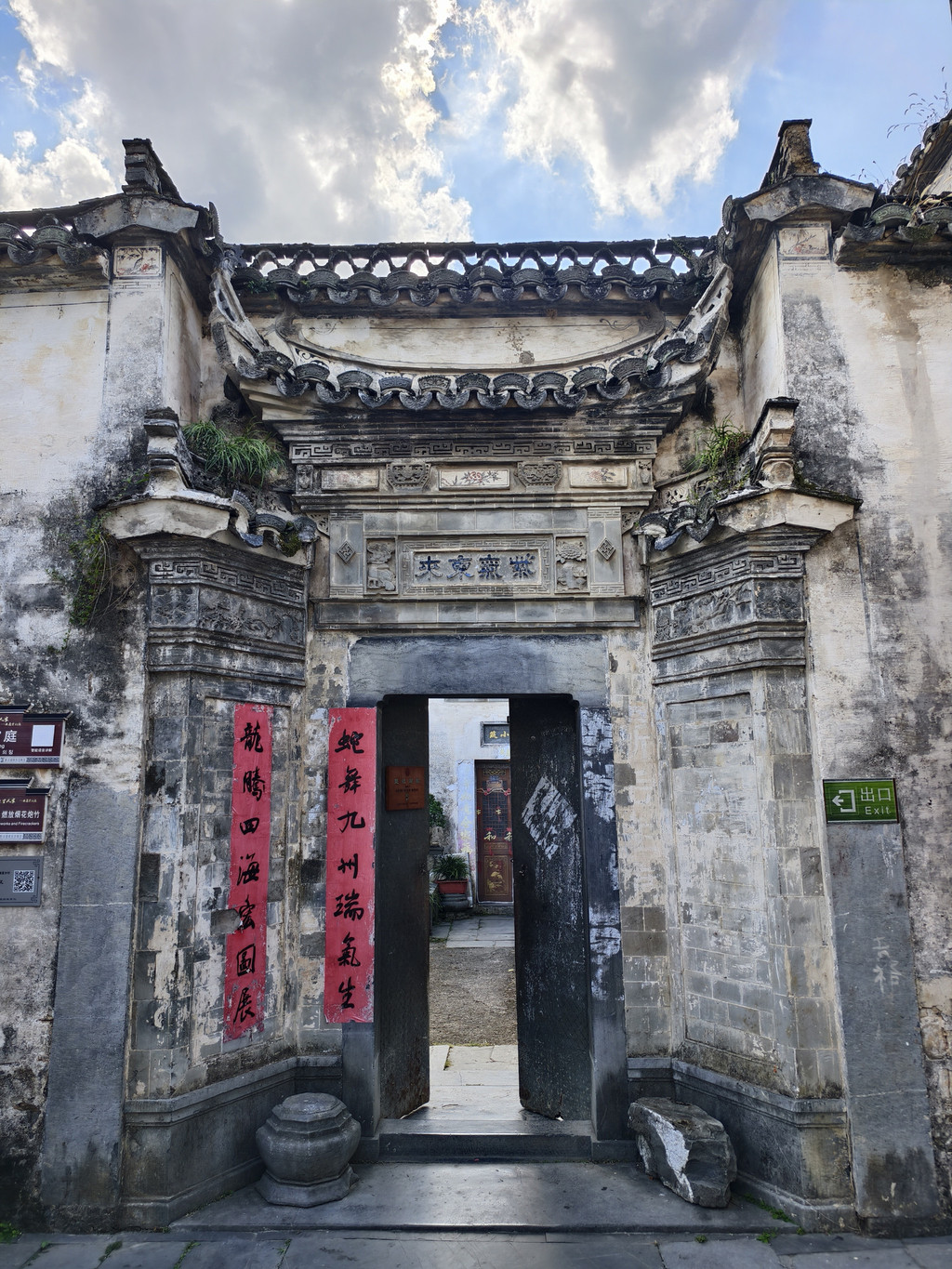 始建于清康熙年间的旷古斋门楼精美,门楼是身份地位的象征,徽州人十分重视门楼的修建,有“千金门楼,四两屋”之说,建于院墙上的徽州古民居门楼及门罩雕刻有精美徽州三雕——木雕、砖雕、石雕,制作得富丽堂皇,展现了新安画派和徽州版画深厚的艺术根基。