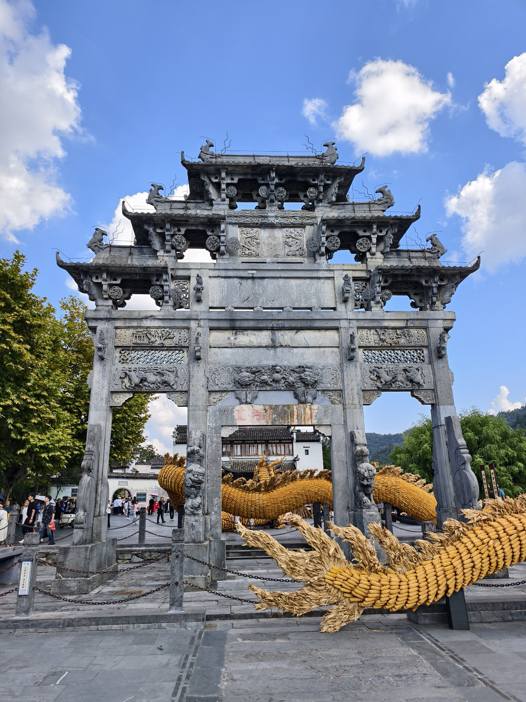 走进西递村口,迎面就见西递标志性景观胡文光刺史石牌坊。这座石牌坊建于明万历六年(公元1578年),高12.3米,宽9.95米,系三间四柱五楼单体仿木石雕牌坊,峥嵘巍峨,结构精巧,是西递胡氏家族地位显赫的象征。石牌坊通体采用当地的“黟县青”大理石雕筑而成,整个牌坊上下用典型的具有徽派特色的浮雕、透雕、圆雕等工艺装饰出各种寓意深刻的图案。胡文光牌坊造型庄重典雅,成为明代徽派石牌坊的代表作。