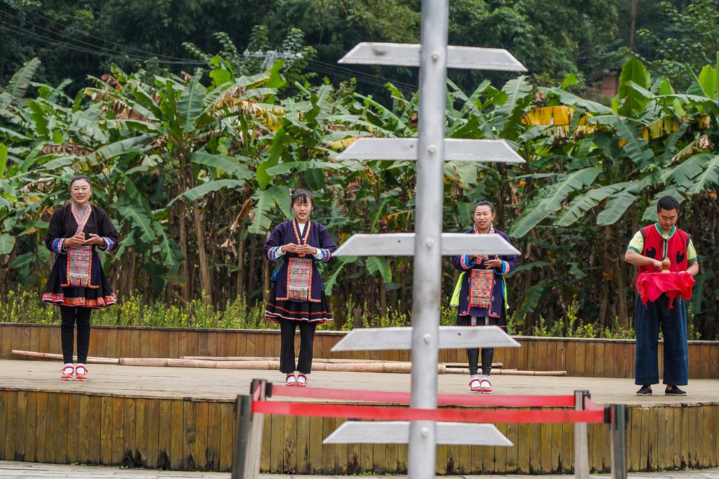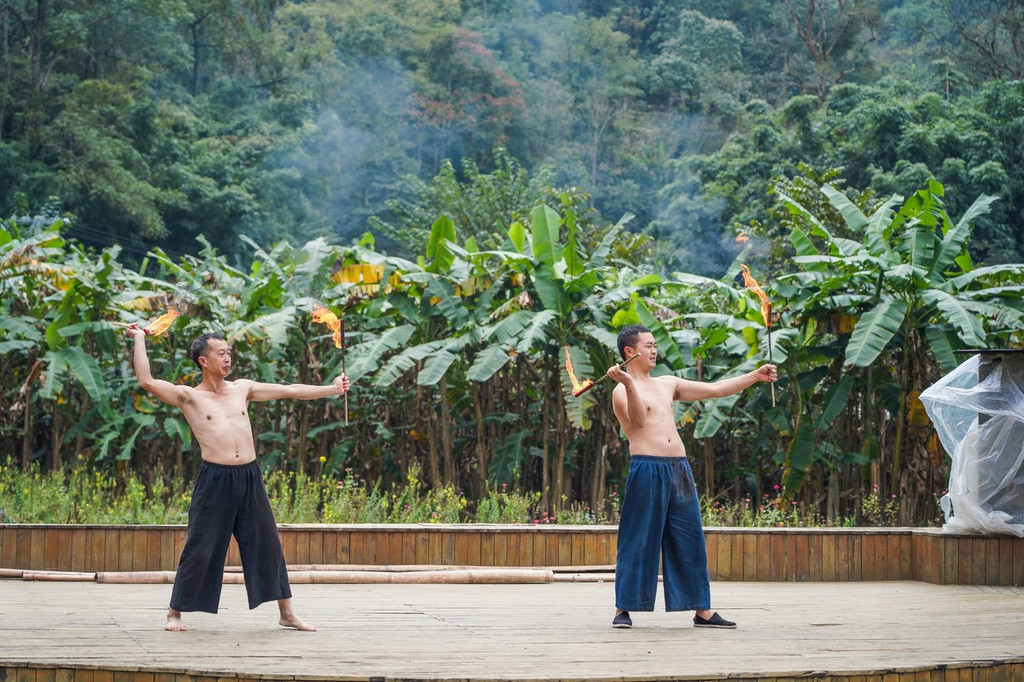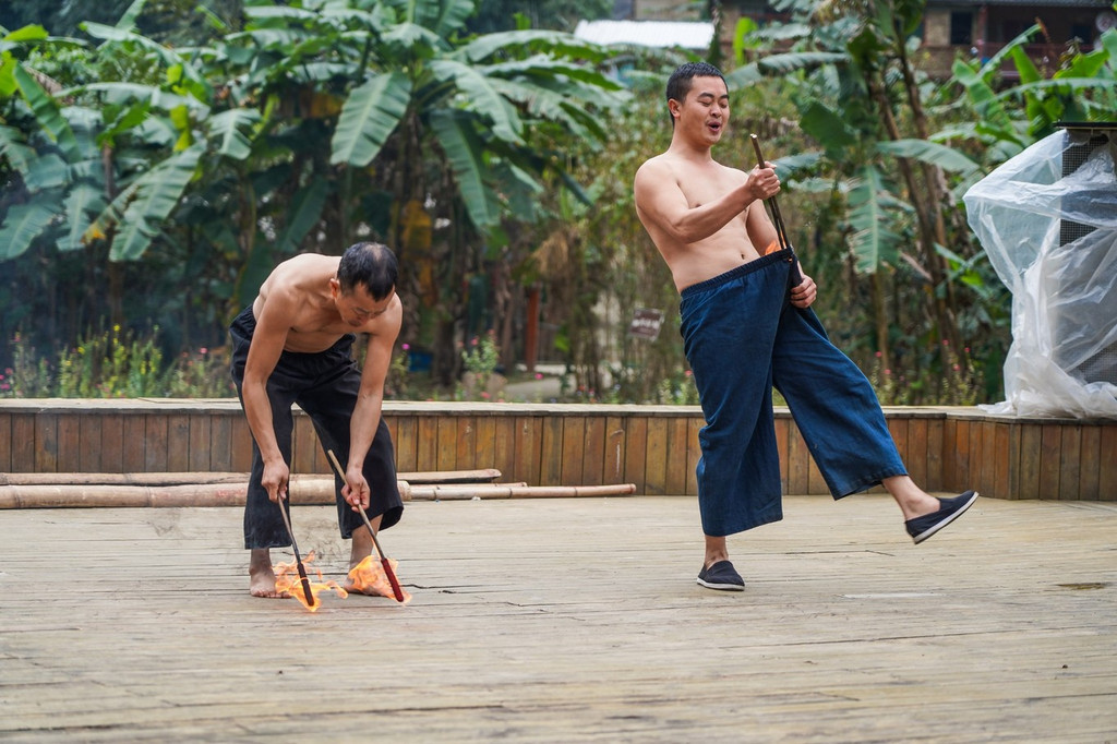 苗寨还有民族特色歌舞表演,还有“上刀山、下火海”的绝技表演。