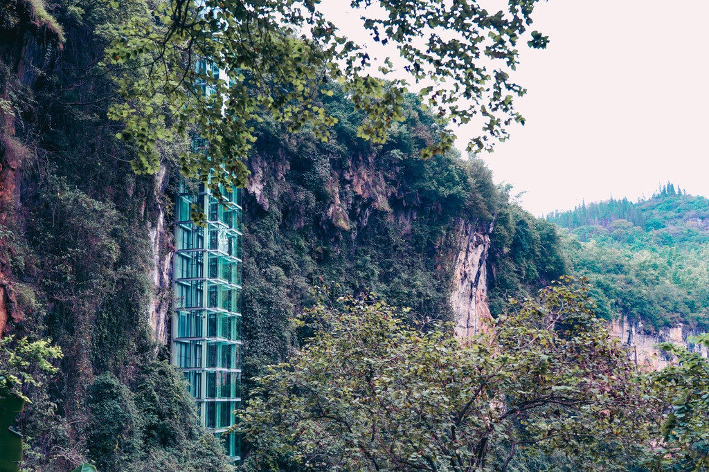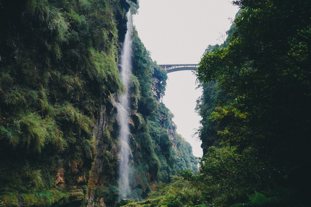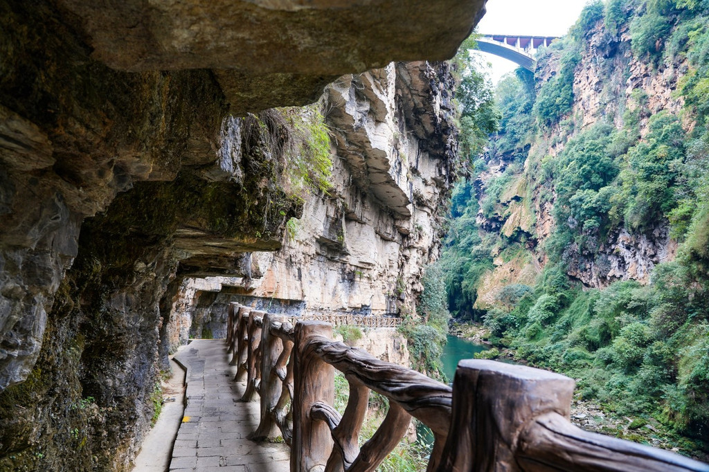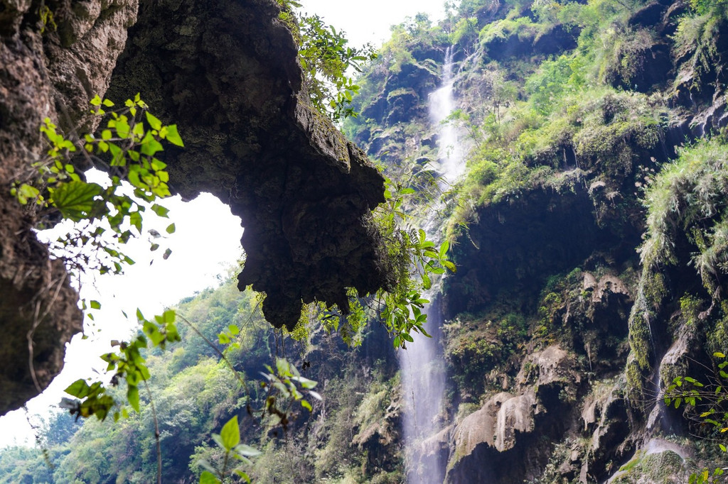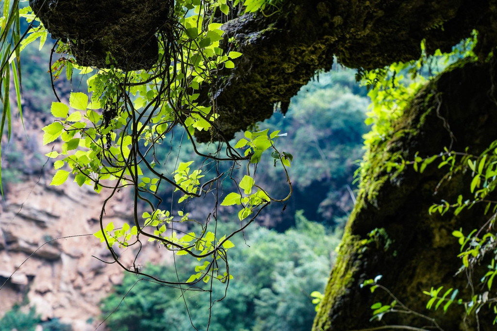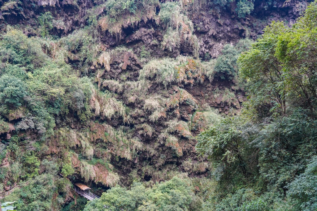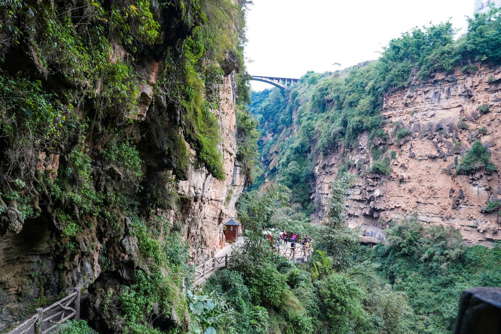 景区的观光路线很简单,就是在谷底绕一个圈。在景区小青山入口进入景区,乘观光电梯下到谷底,在雨洒芭蕉长廊可欣赏雨洒芭蕉瀑布,然后左拐,沿河西边的游道前行。