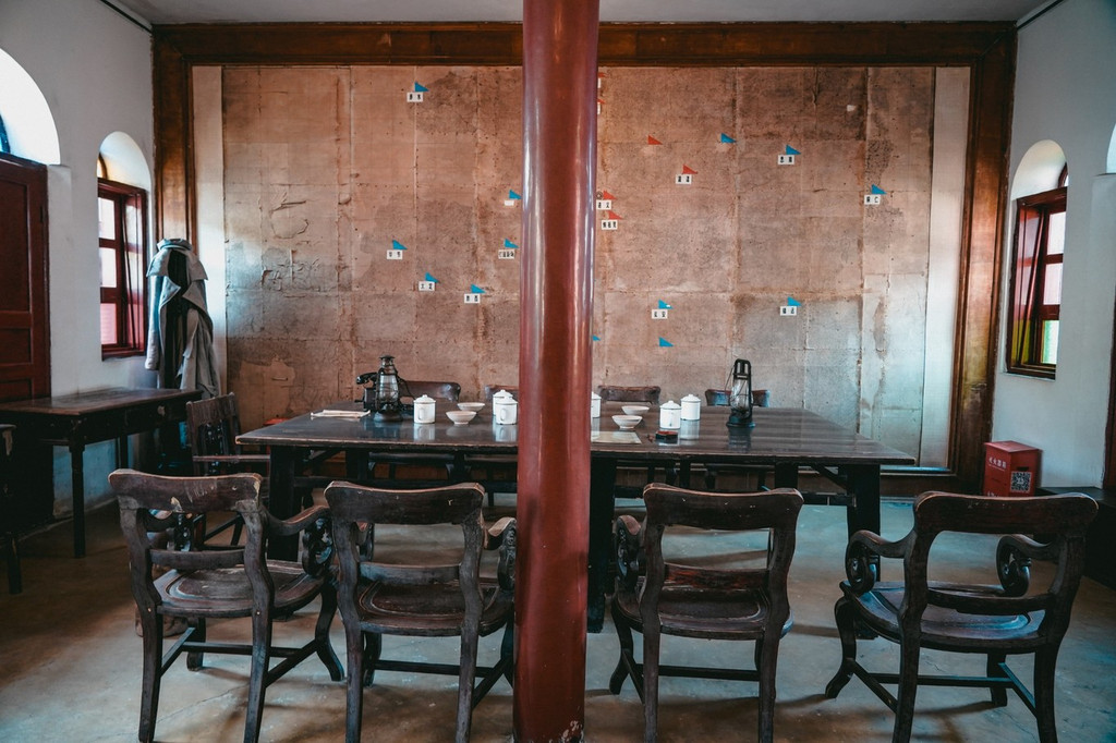 会址是一座坐北朝南的二层楼房,为中西合璧的砖木结构建筑。上盖小灰瓦,歇山式屋顶上开一“老虎窗”,有抱厦。