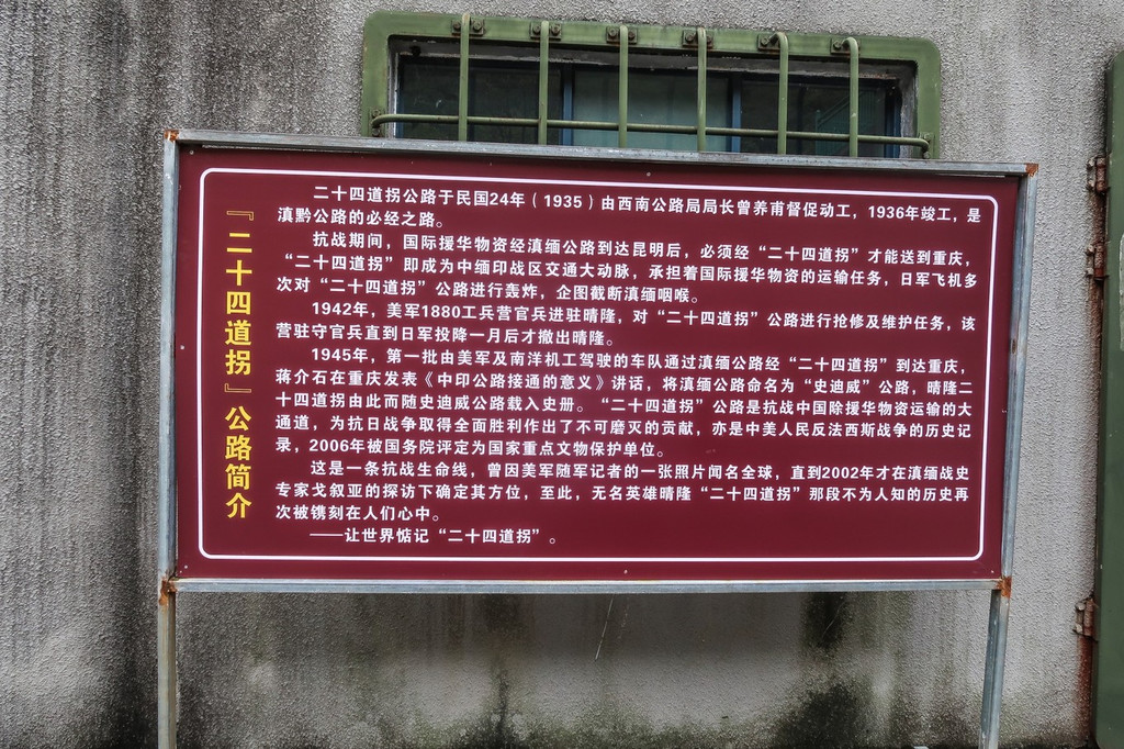 “二战”时期, 美国 的援华物资经过滇缅公路到达 昆明 后,必须经滇黔线“二十四道拐”才能运送到前线和 重庆 ,它成为盟军中缅印战区的交通大动脉,承担着国际援华物资的运输重任,被誉为抗战的“生命线”,现保留有“美军墙”、“美军车站”等遗迹。