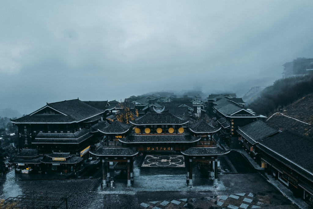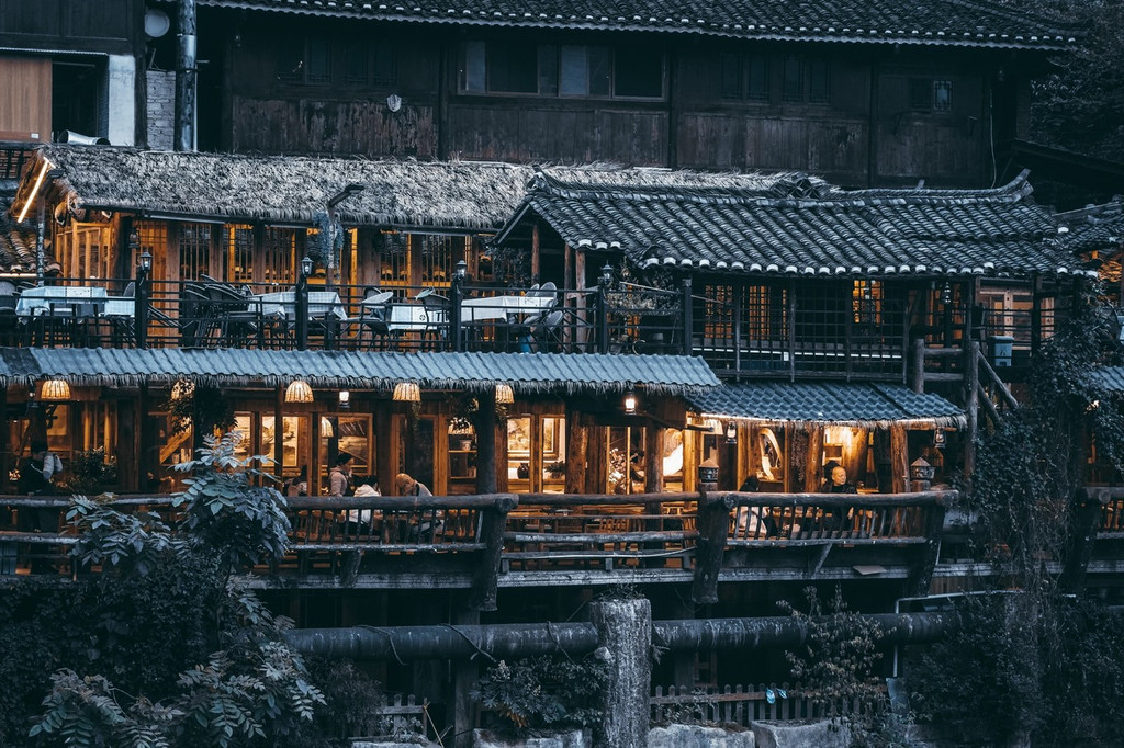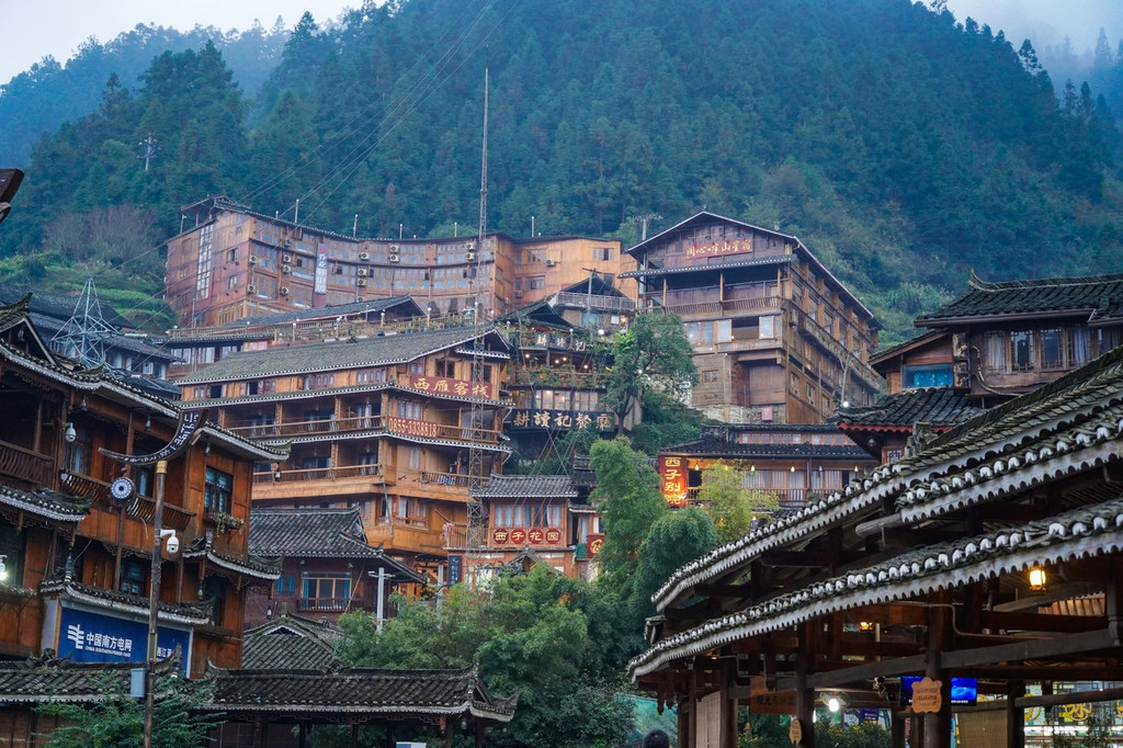 西江 千户苗寨的苗族建筑以木质的吊脚楼为主,为穿斗式歇山顶结构。