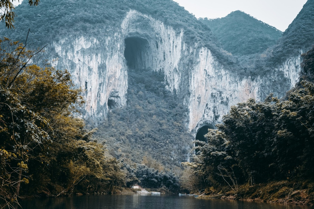 岩壁陡峭,上下各有一个很大的溶洞,上面那个叫做“穿上洞”,穿 通山 体,可以看到洞另一边的天空,下面靠近水面的那个洞就是燕子洞。