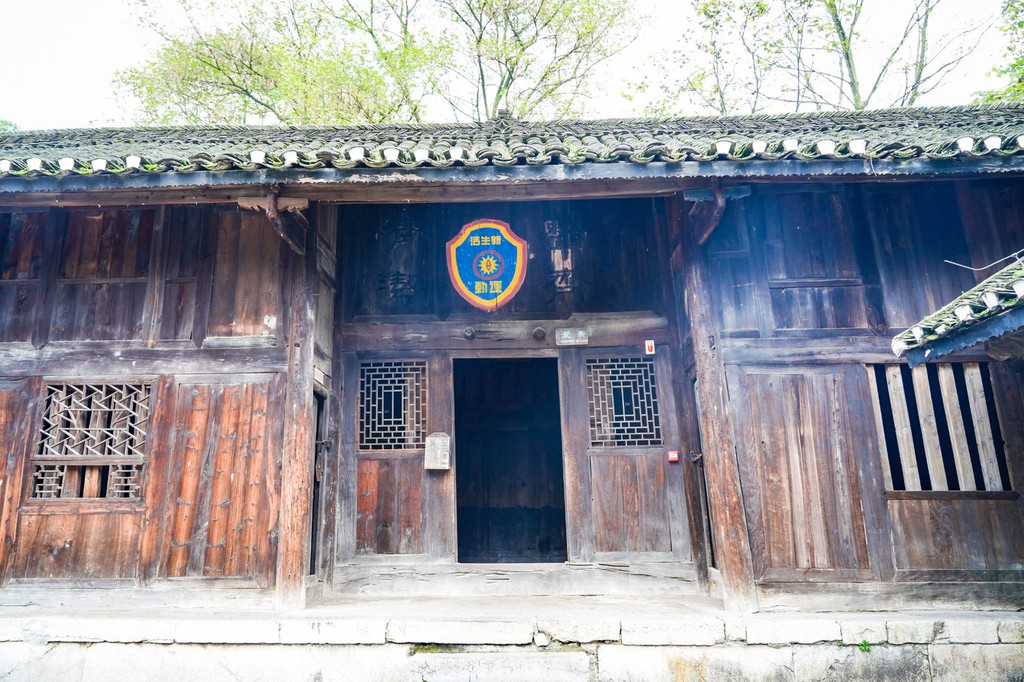 会址大门临街,门两侧原是八间铺面,是柏辉章家的商店。进大门,穿过厅,迎面是一座巨大的砖彻牌坊,上有彩瓷碎片嵌字,前为“慰庐”,后为“慎笃”。过牌坊是小天井,天井南侧有小门通往柏家的内四合院,北侧是主楼。