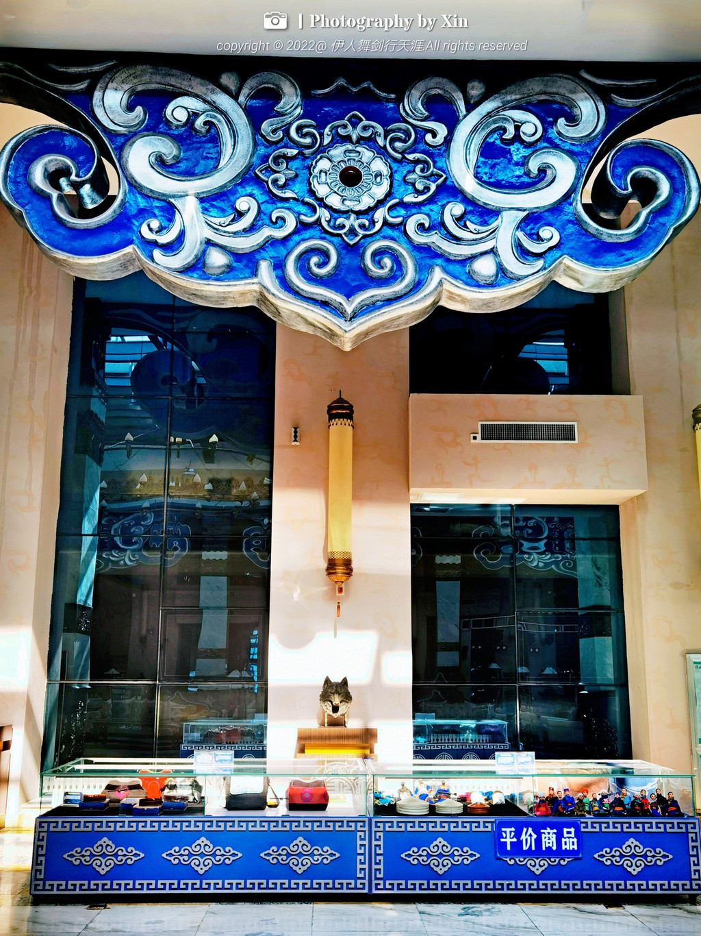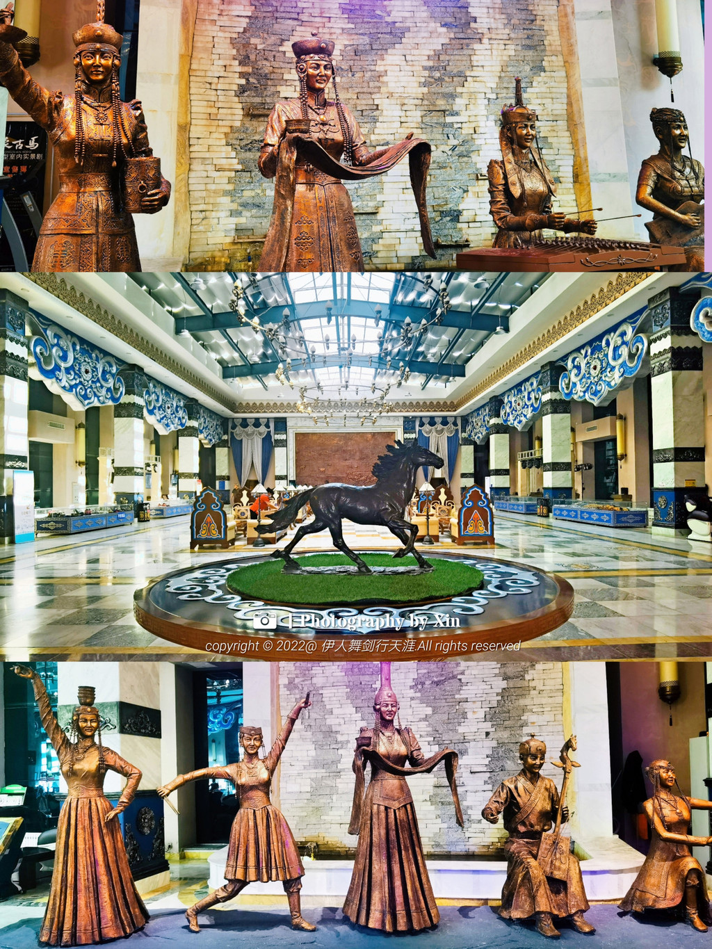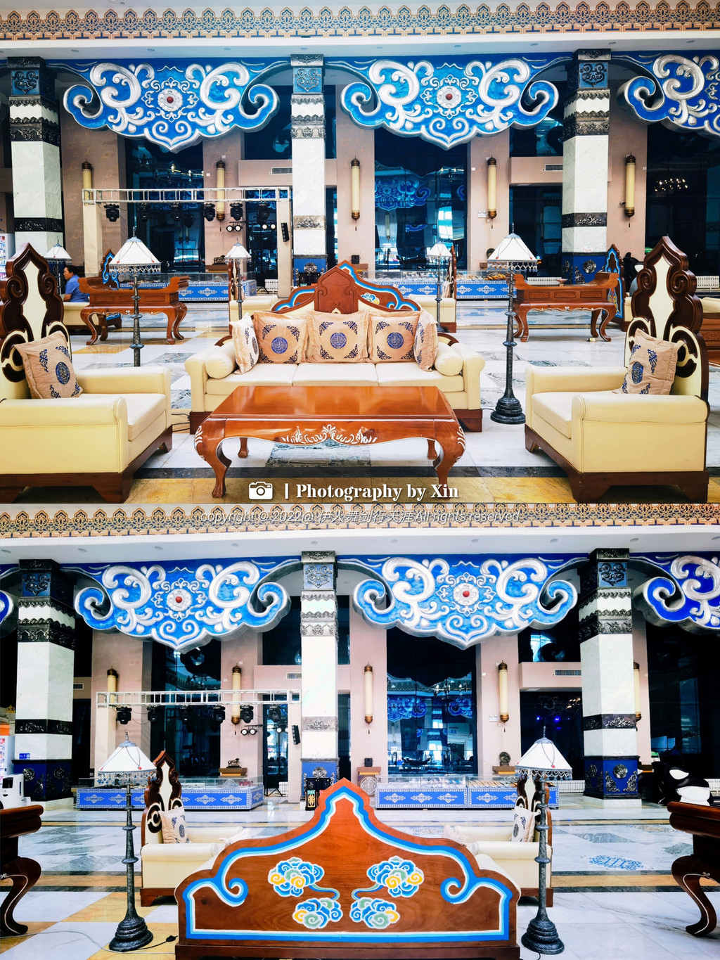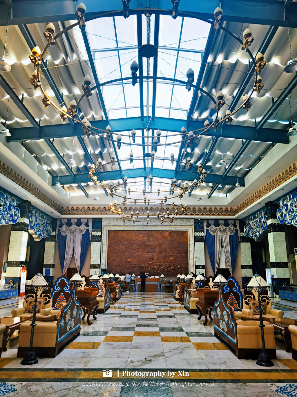 作为建筑设计美学爱好者,走进酒店就被整体设计所吸引,1500平米气度非凡金碧辉煌的酒店大堂,一梁一柱,一帛一画,无不包含当地特色元素,总服务台背景是由一块铜镶嵌而成,图案有平顶山、锡林河、蒙古包等组成,是锡林郭勒草原的缩影,整体看上去磅礴大气,尽显气质,细微之处更是体验了独具匠心!
