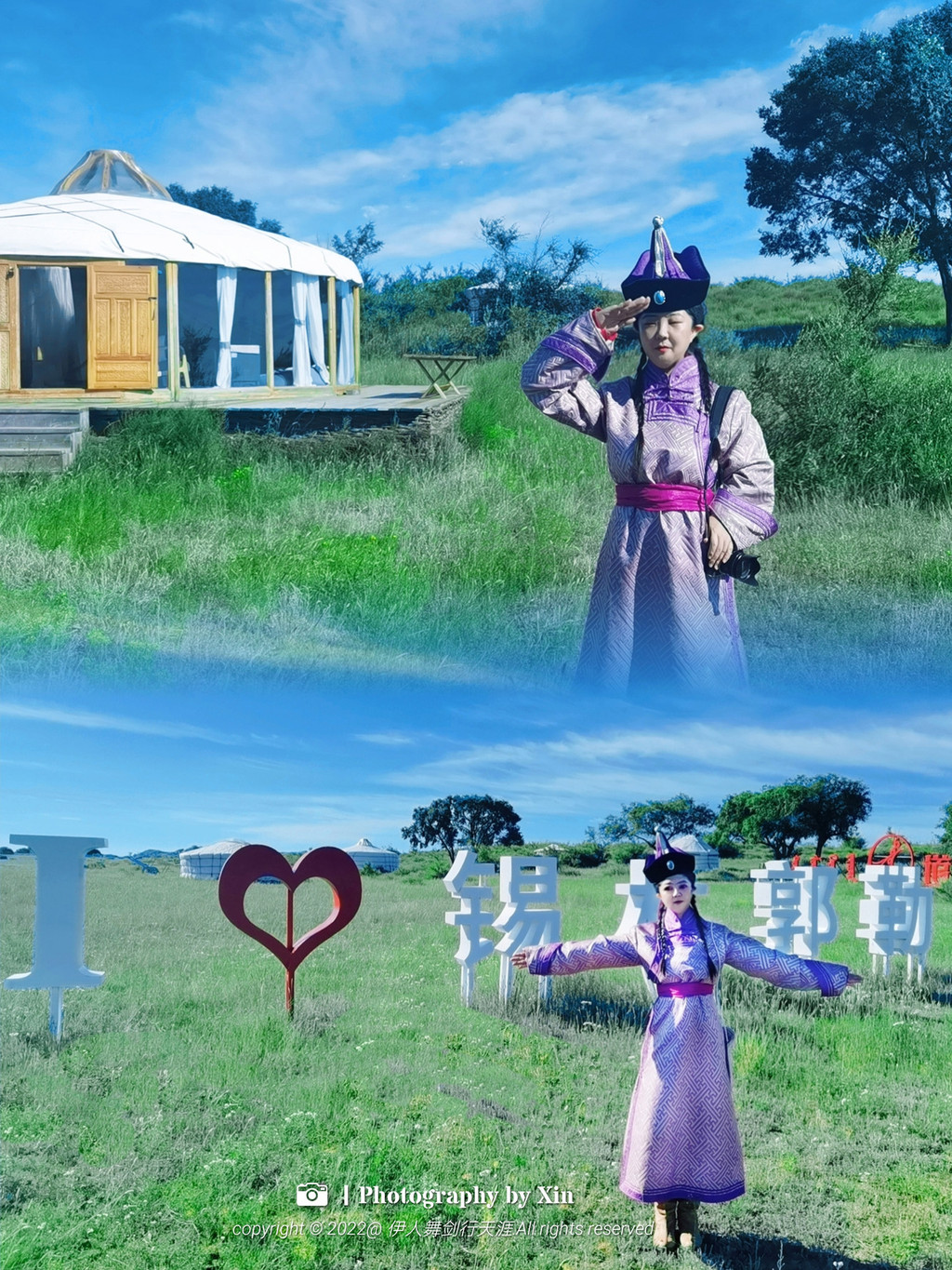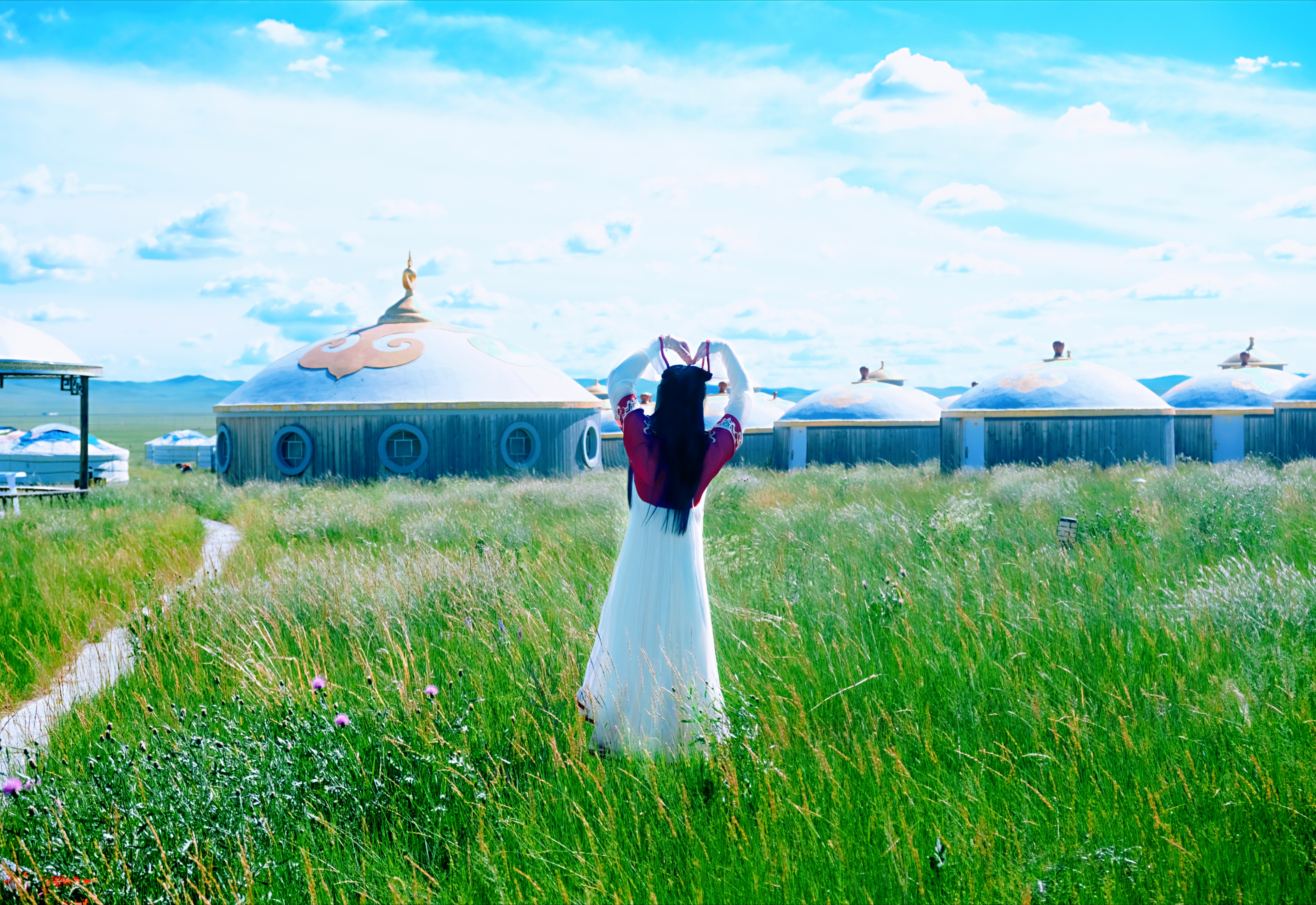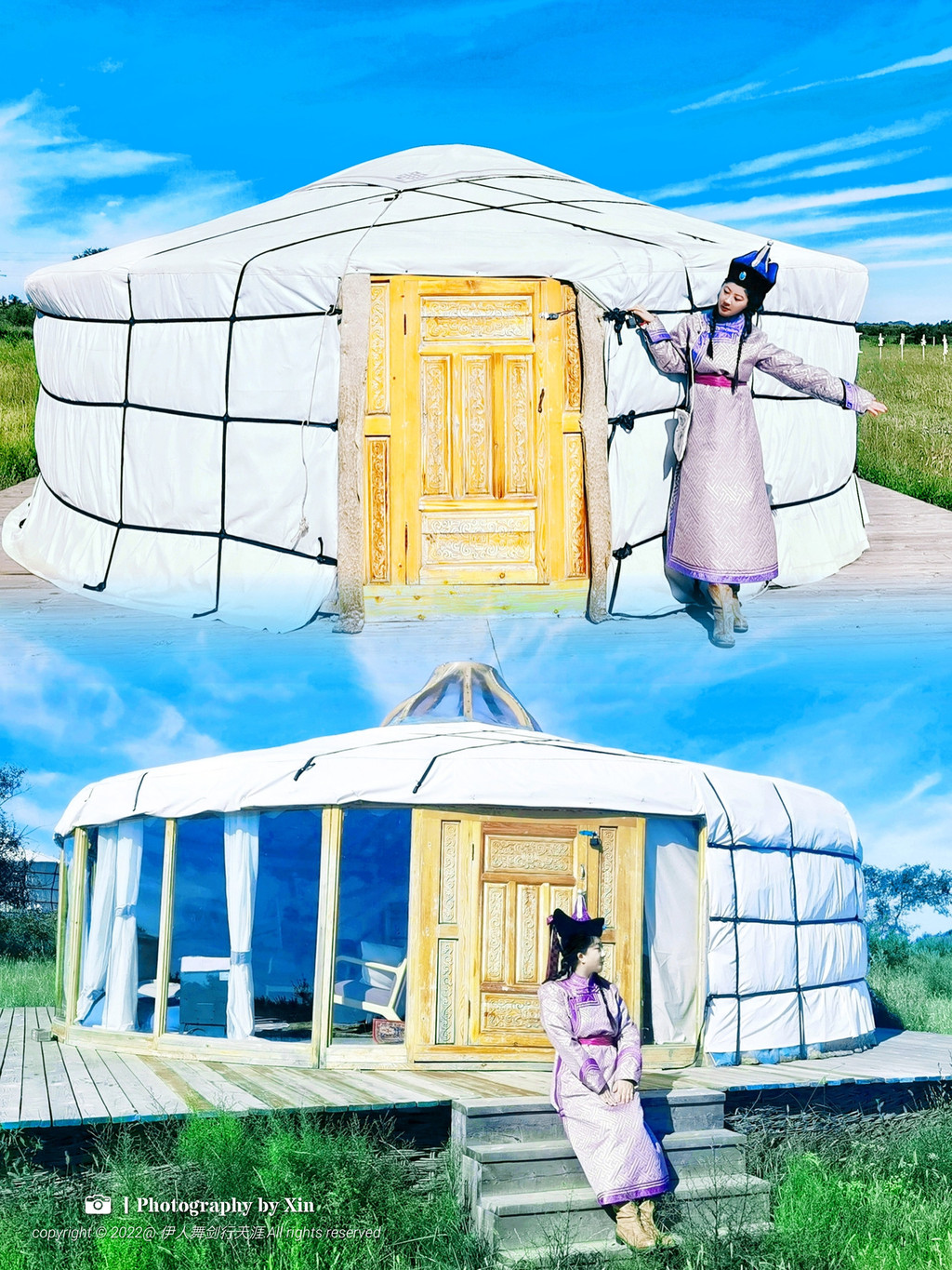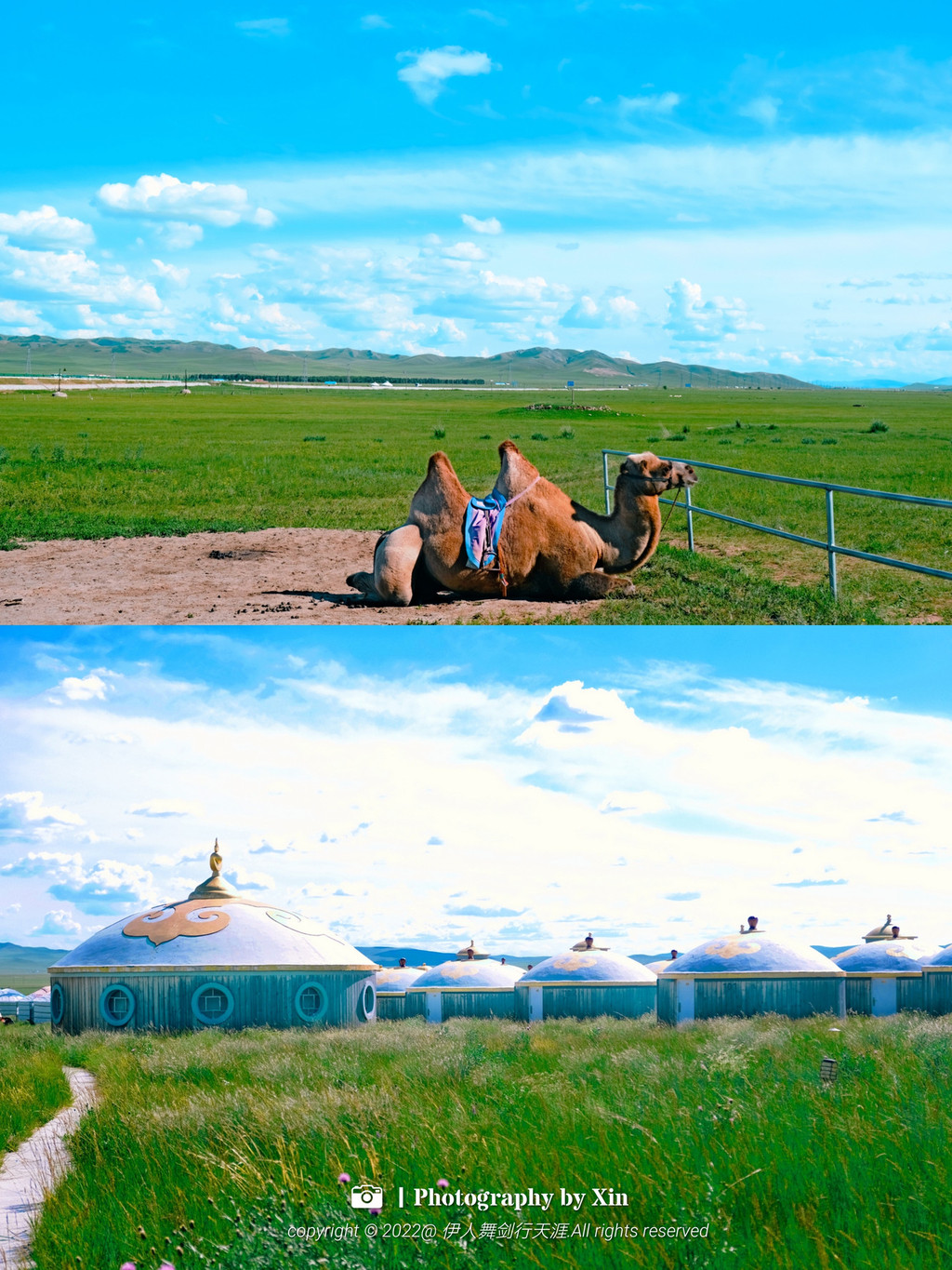 在这里我们换装变身后,奔走在这片大草原上,蒙古包前,牛车边,在羊圈里。在这里我们可以完全放空自己,听风声与自然对话,悦马蹄声敲醒大地,看日出日落享受幽静的夜空。