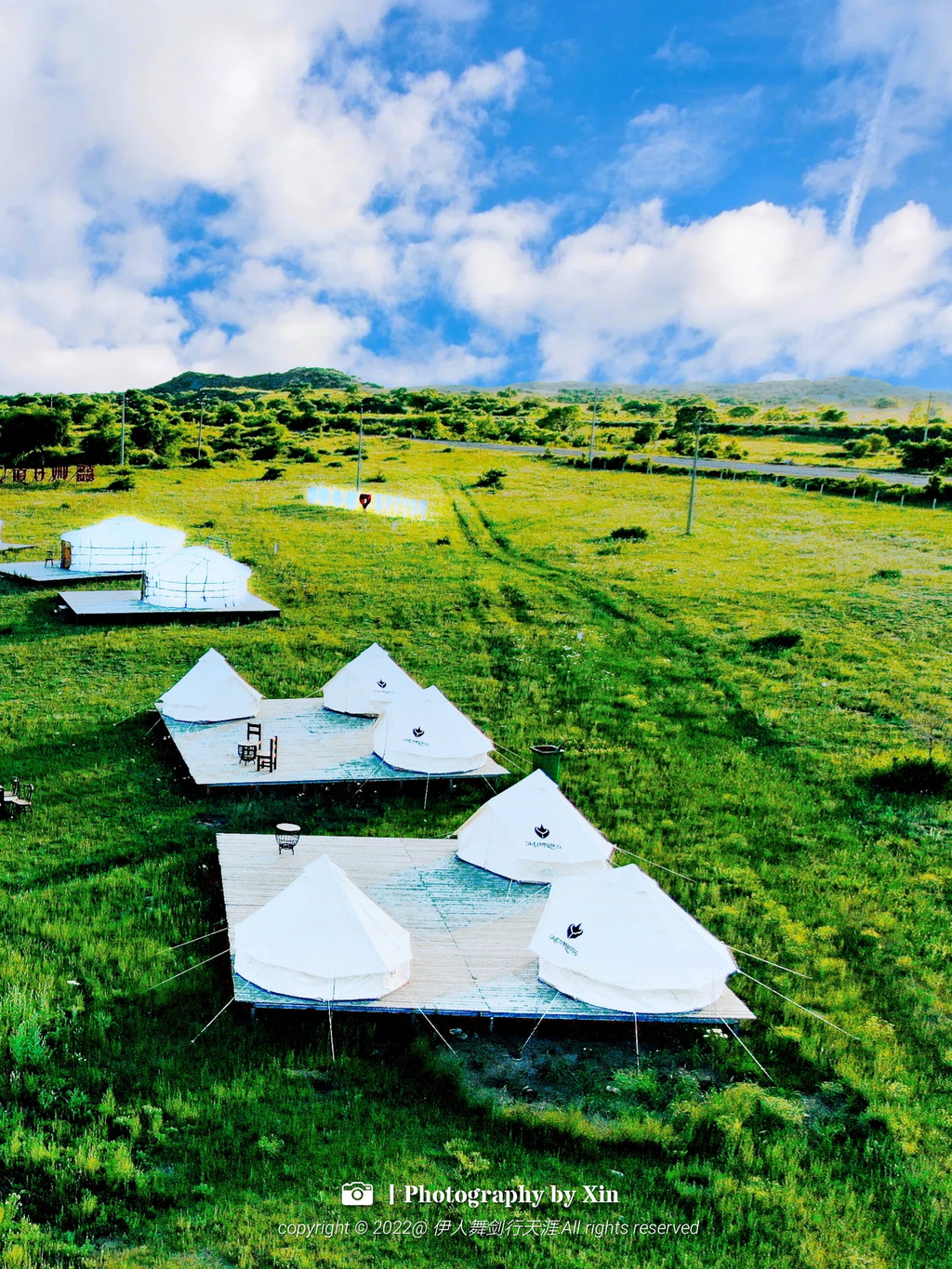 周边草原风光美丽,从主接待包向四周看去,地势开阔,蓝天白云,碧绿的草原上游动着牧人的羊群,蒙古包里升起袅袅炊烟。