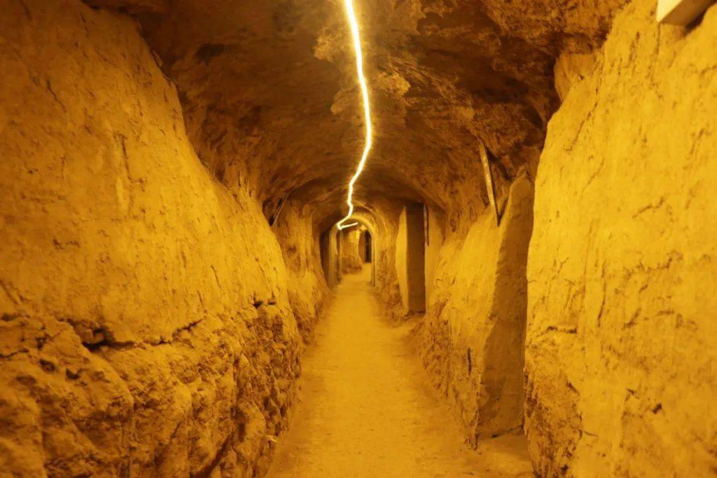 汉藏兵洞景区里面的地下古洞全长1800米,洞内冬暖夏凉,常年恒温24℃左右。空间较为狭窄,洞内安装了灯带,所以看得很清楚。巷道里有多间土窑, 可以住人,还有小型粮仓、厨房,以及随处可见藏有兵器的小土洞。