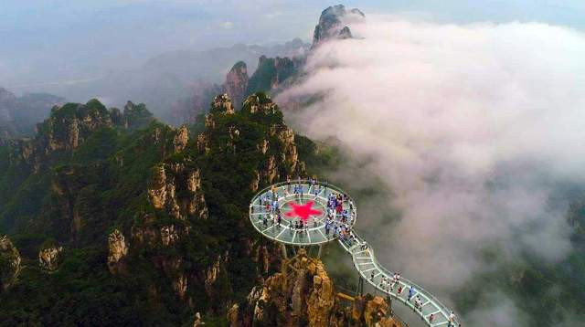 如果你的胆子比较大,那就去黛眉山的玻璃栈道吧。听当地人说,这是"河南最刺激的玻璃栈道",这座5D式建筑,建在海拔1300米的峭壁上,构成了黛眉山一道靓丽的风景线。