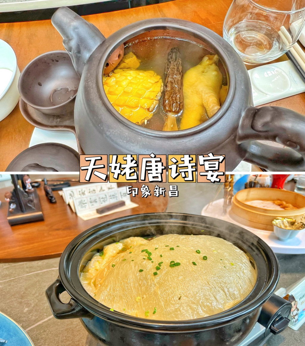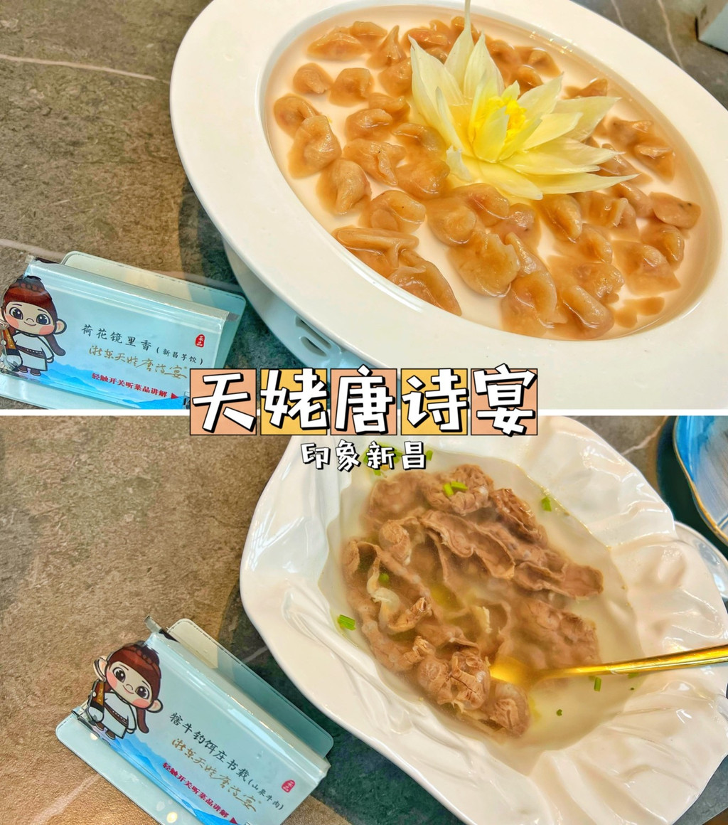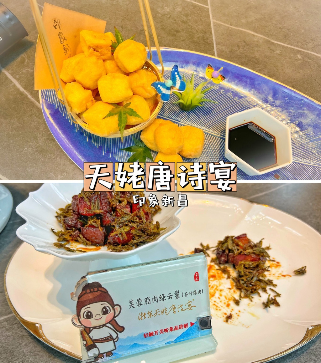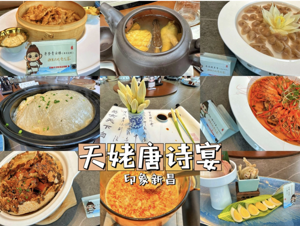印象 新昌 的天姥唐诗宴,每道菜上桌前,身穿汉服的天姥唐诗宴代言人“李梦白”先报菜名,上菜仪式感满满!