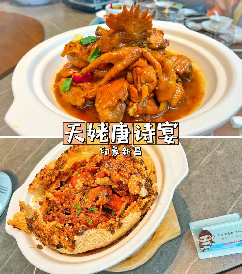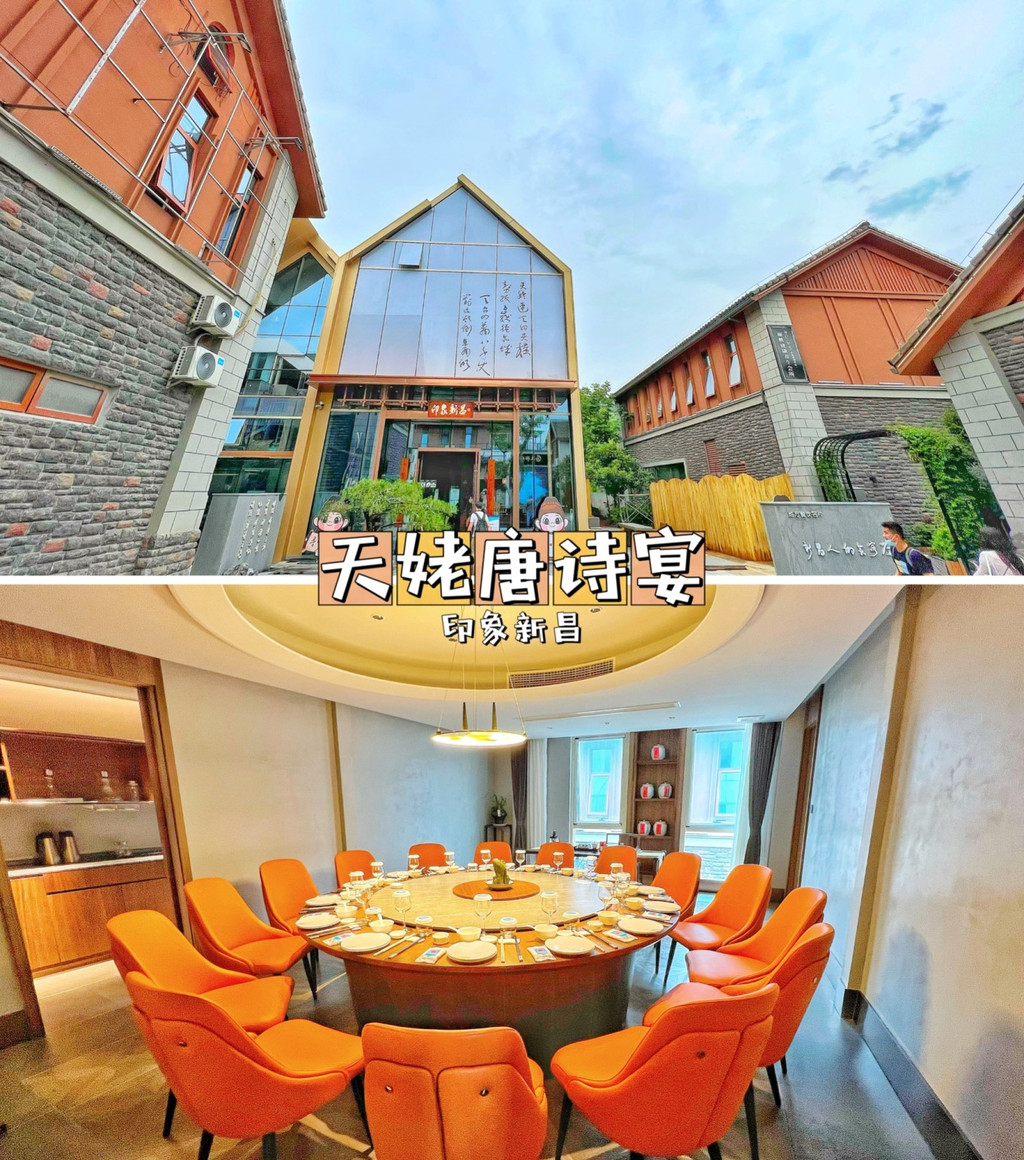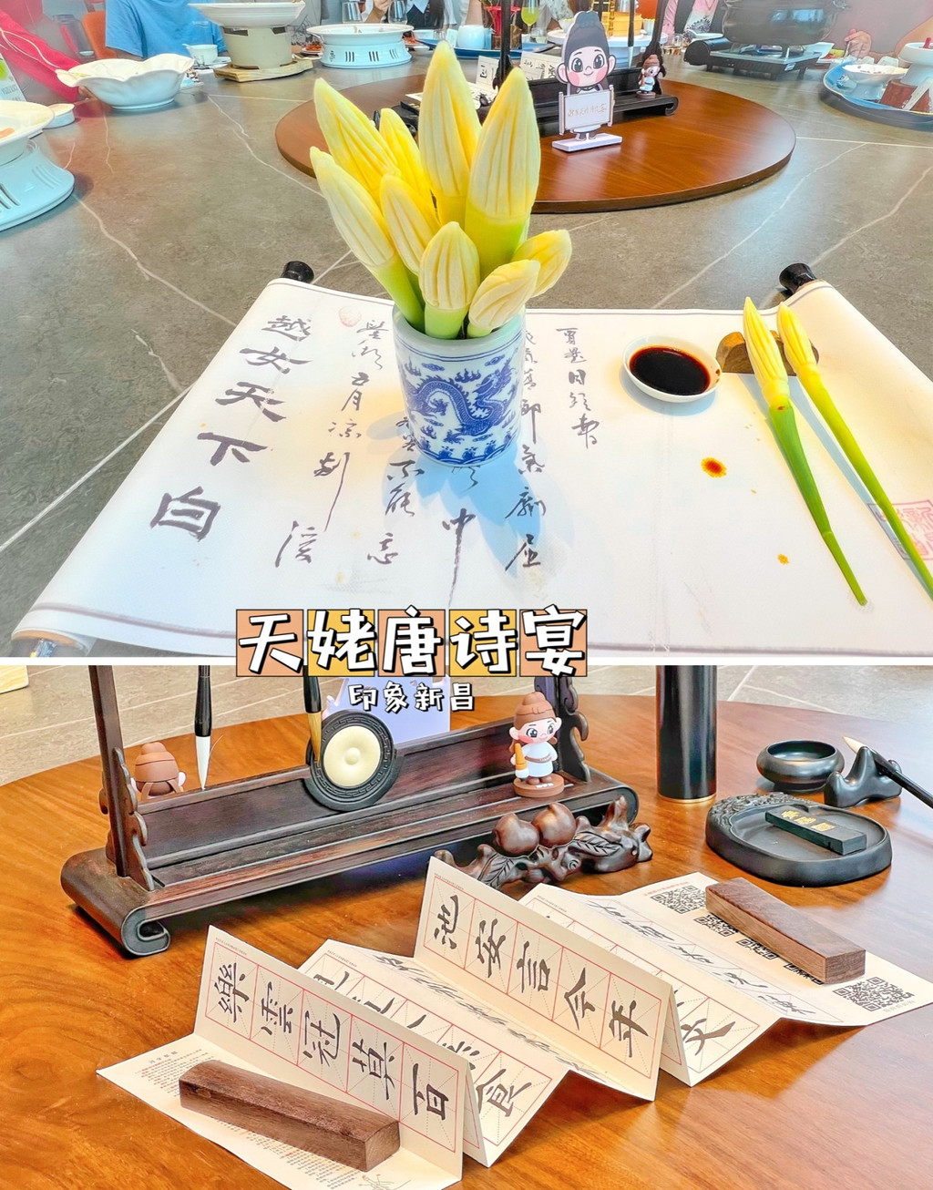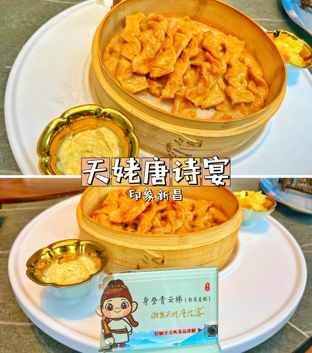 印象 新昌 的天姥唐诗宴,每道菜上桌前,身穿汉服的天姥唐诗宴代言人“李梦白”先报菜名,上菜仪式感满满!