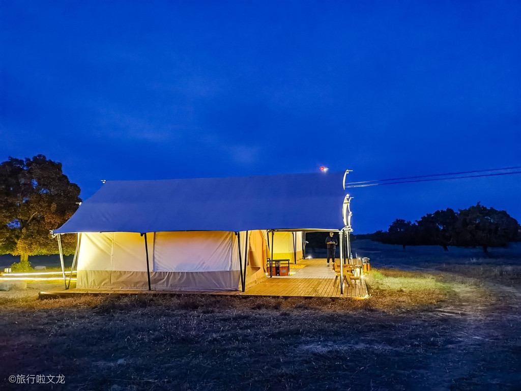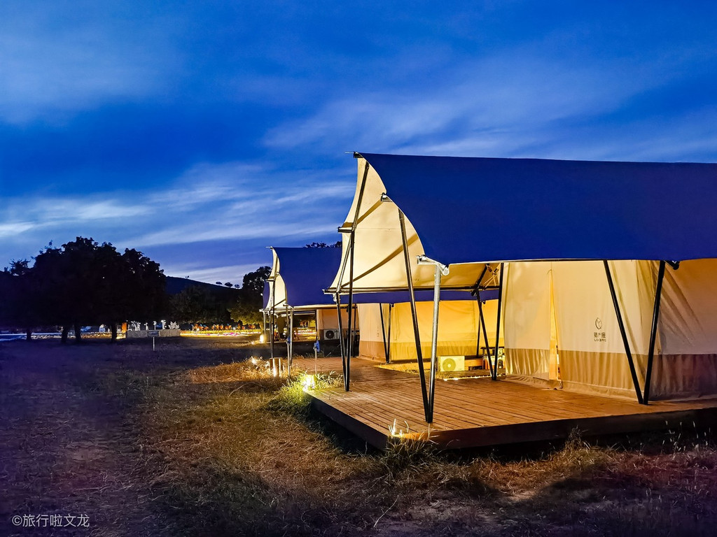 夜晚五色枫景区的天空依旧有蓝色,在帐篷外面看星星,看月亮也是很享受的,如果合适的季节,不错的天气,这里可以拍星空,感受浪漫。