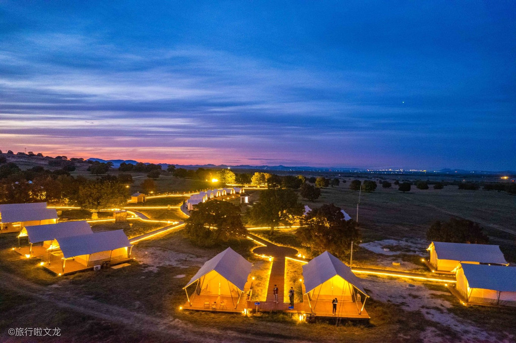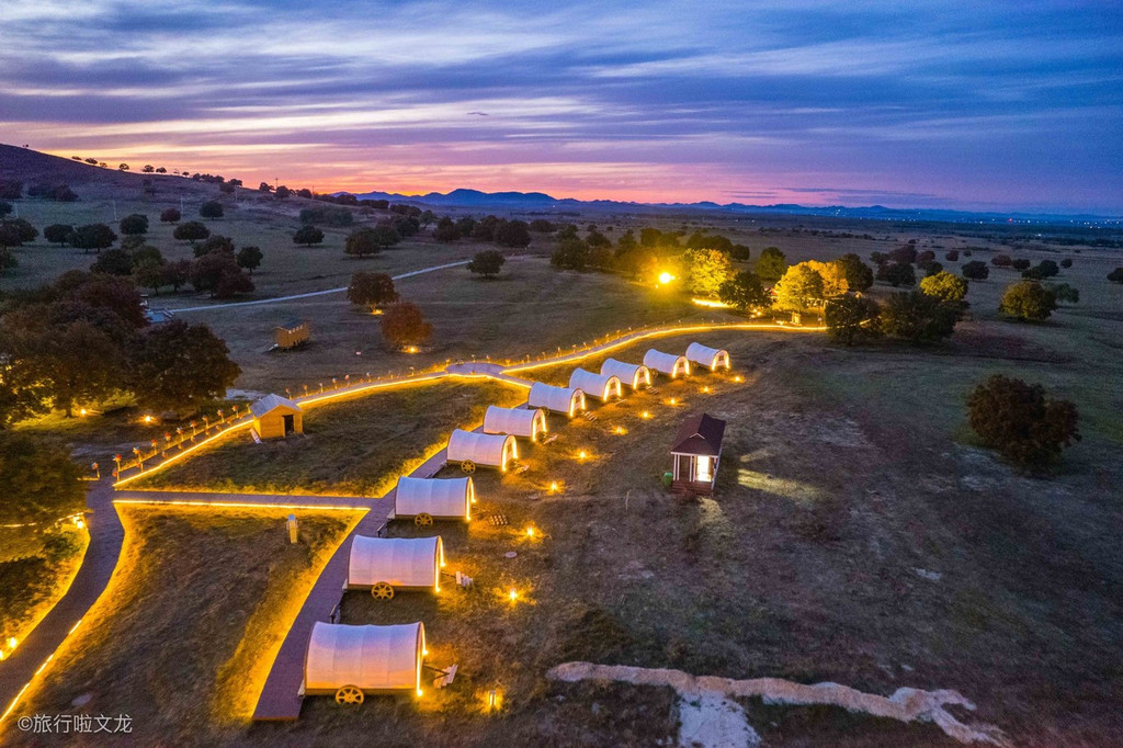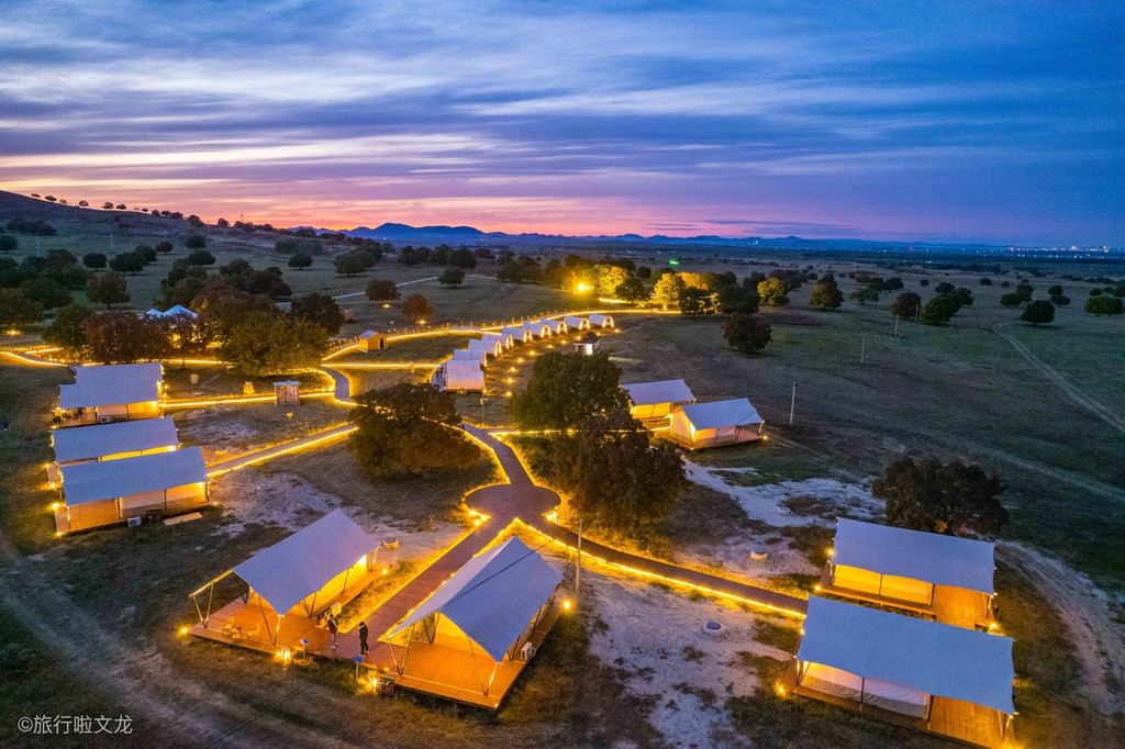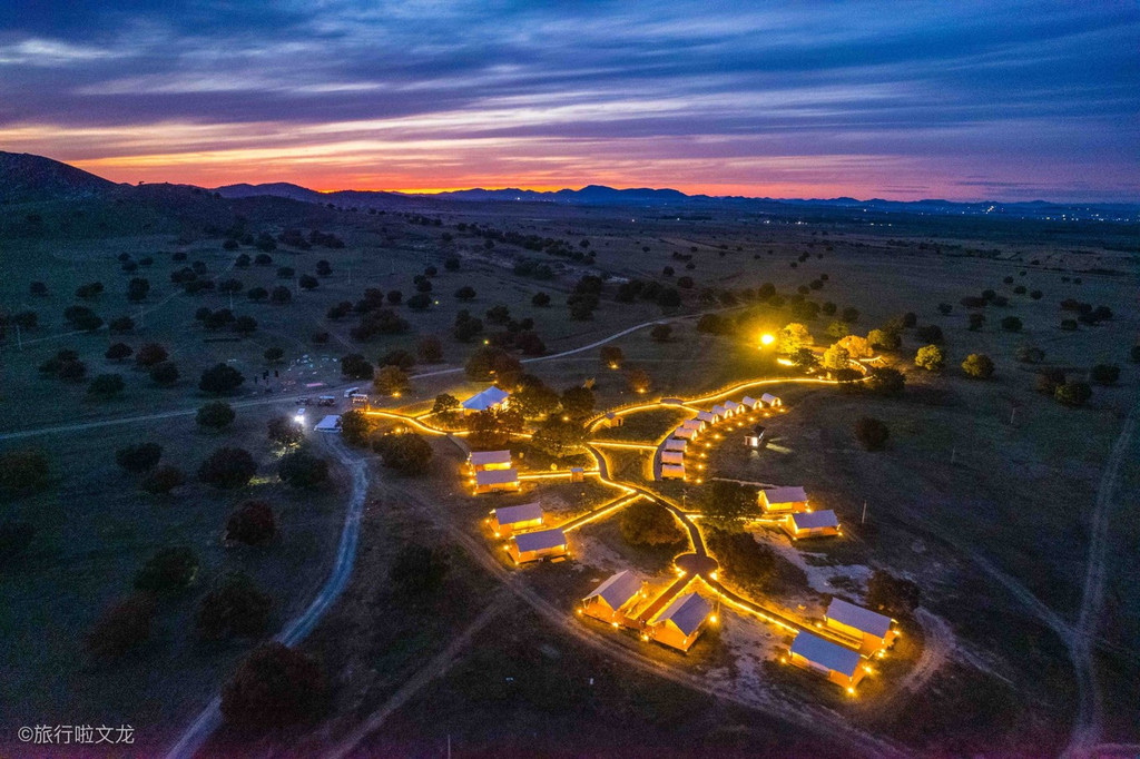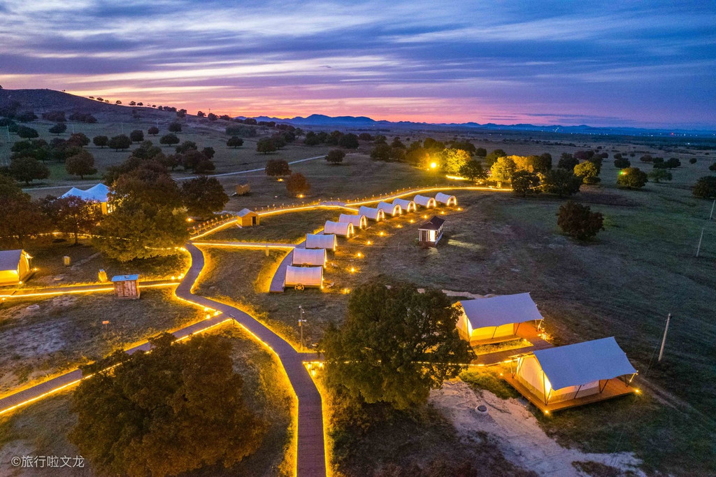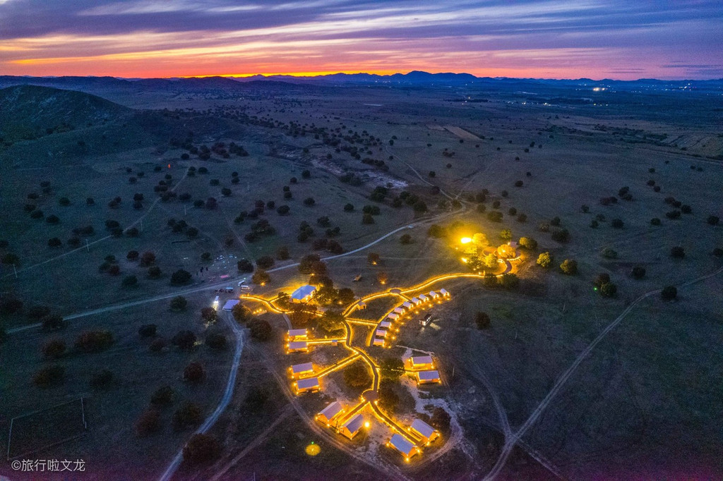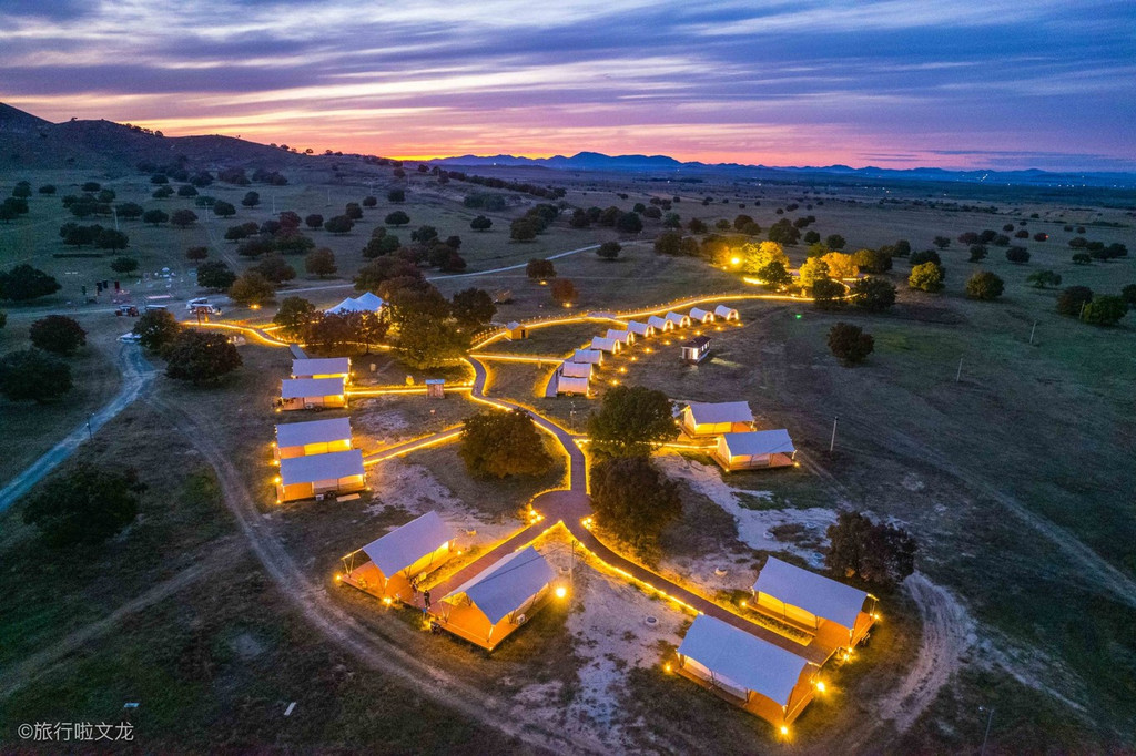 傍晚我们的帐篷区域灯亮起来的时候,映着天边的霞光,就像是一个童话小镇,夜晚的童话小镇是十分梦幻的,黄色暖灯光的亮起,让整个五角峰景区,十分的有氛围。