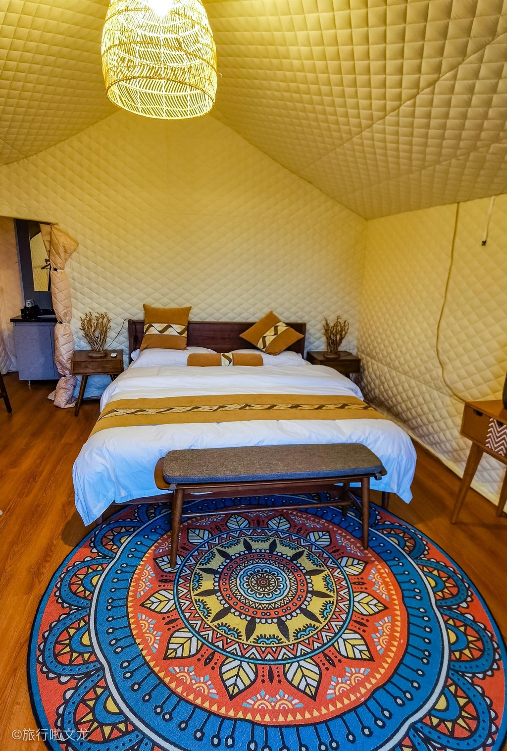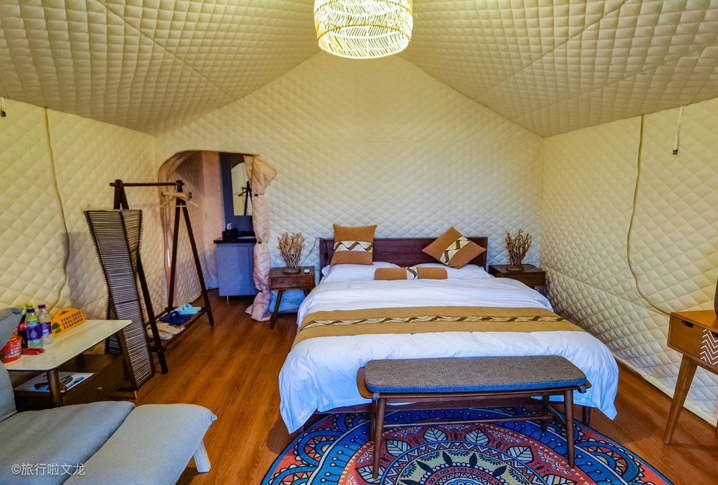 进入帐篷之后,映入眼帘的是一个并不大的空间,但是看着还是很温馨的,虽然帐篷的面积并不是很大,但是里面的东西是十分完善的,该有的东西都有了,且分配的空间也是恰到好处的,一张简约大方的床,小小的洗漱空间,还有一小点点可以坐着,房间很整洁大方,暖色调的吊灯照在房间里,温馨的感觉油然而生。
