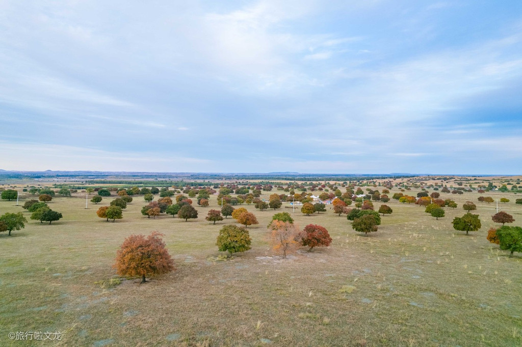 秋天的大草原退出了很多的绿色,一望无际的大草原上显得光秃秃和荒凉了起来,而五角枫景区,在草原上又多了这么多卫士伫立,更是一份美景。