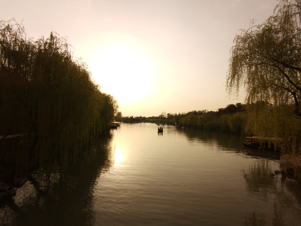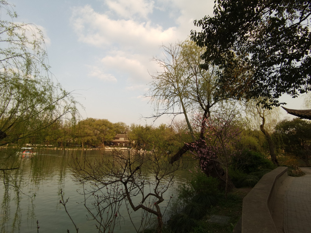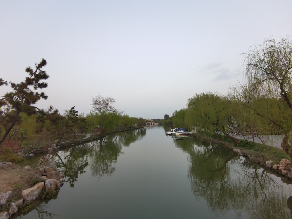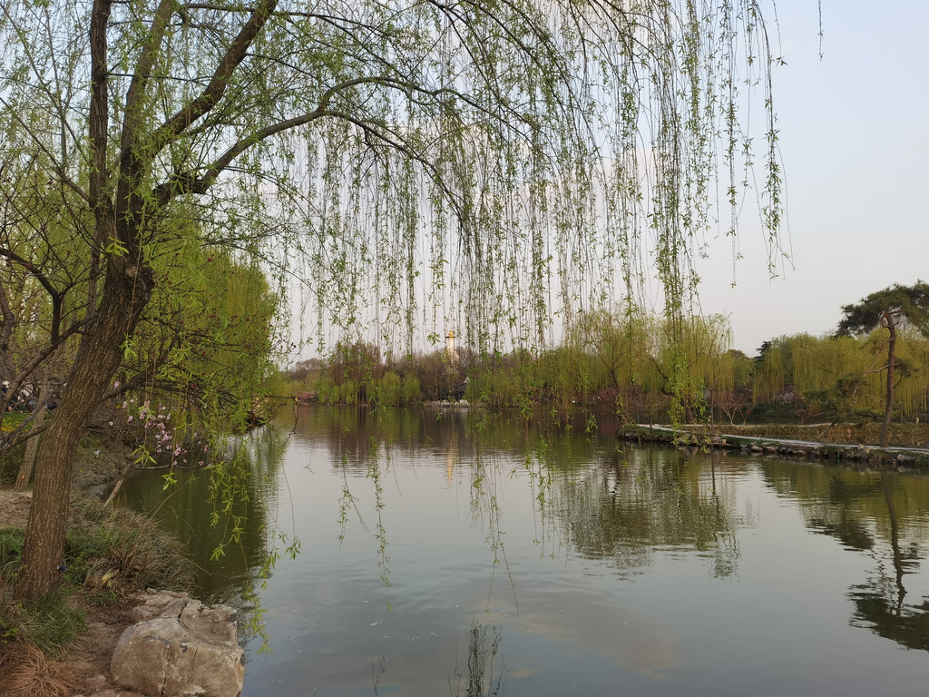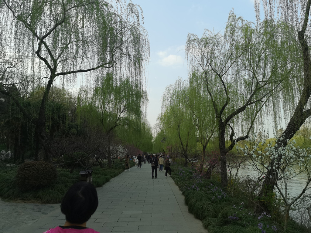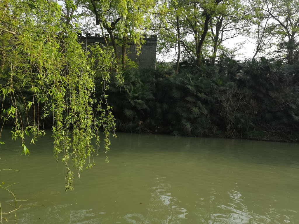 两岸的柳树上已长满了绿油油的柳芽叶子,可惜现时是公历3月,柳树尚未开花,更见不着那春风吹动柳条,花儿飞落,远看如烟如雾、漫天飞舞的柳絮了。