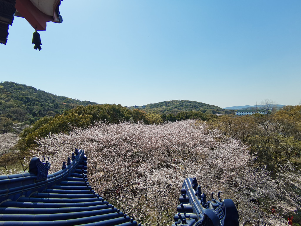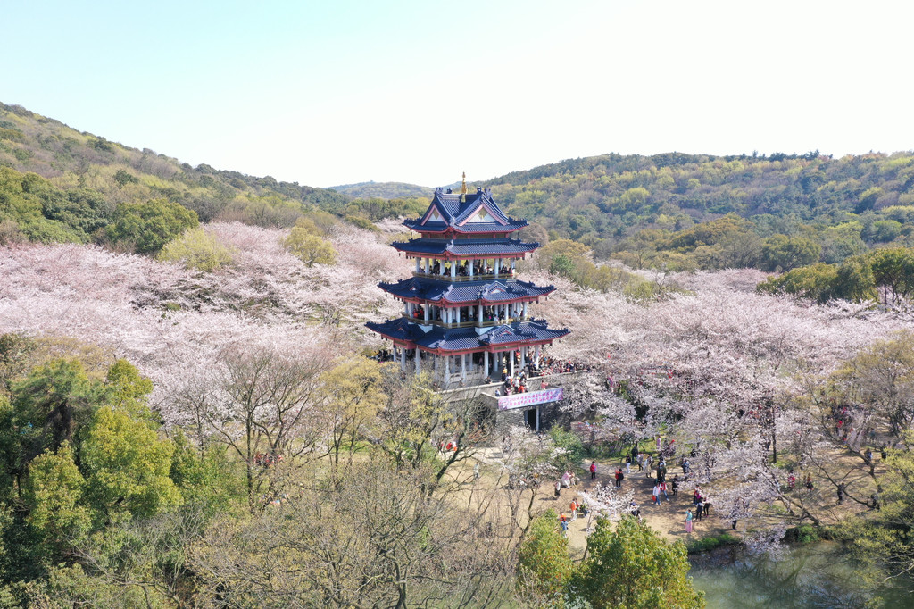 赏樱阁位于鼋头渚樱花林核心地带,是樱花林内标志性建筑景观,登临赏樱阁,居高临下,眺目四望,漫山遍野樱花花海,是鼋头渚风景区内的最佳赏樱胜境。