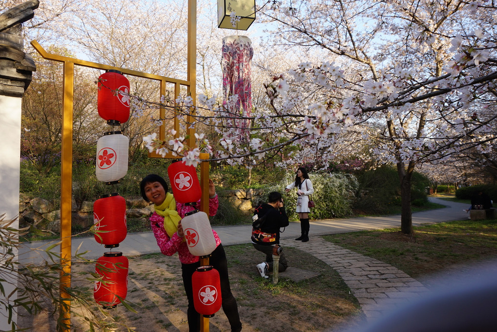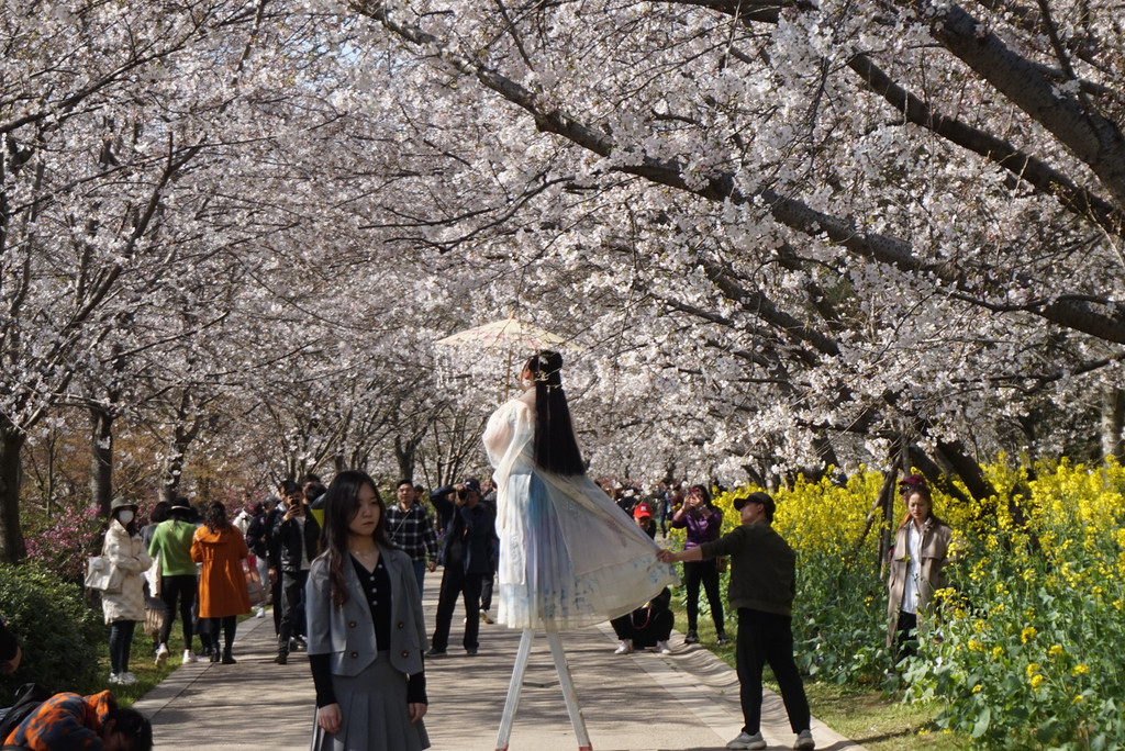 十里花径,有不少游人穿着汉服,站在梯子上拍照,给这里增添了又一道亮丽的风景。