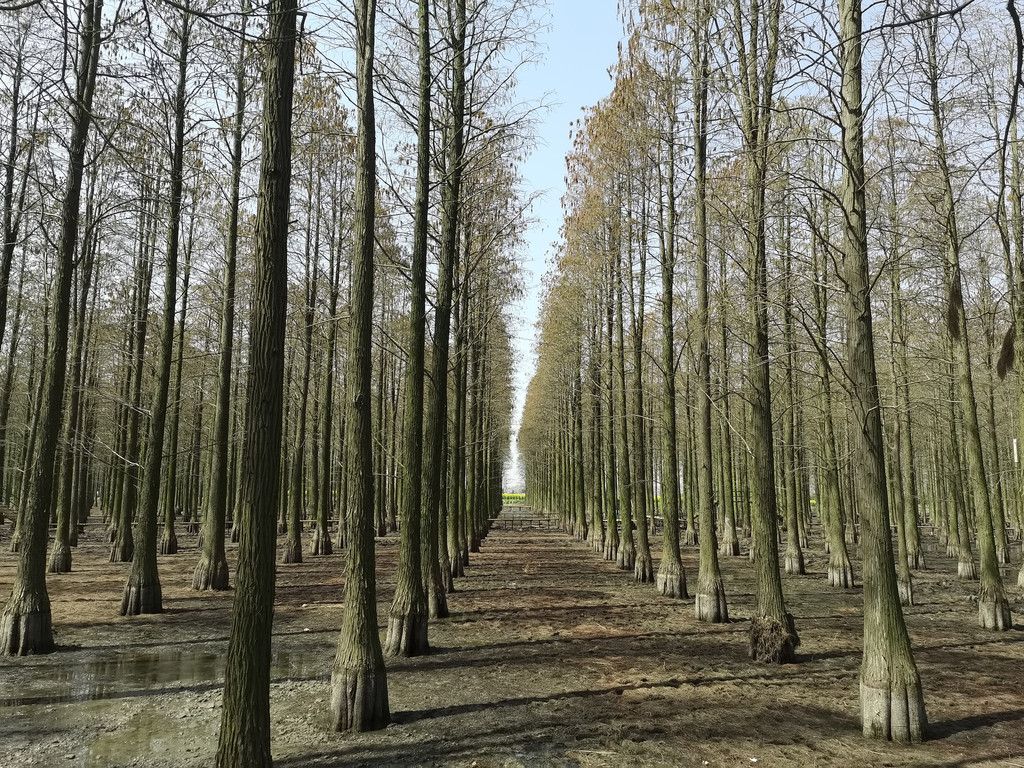 进入绿洋湖,看到了由高大的水杉树编织的屏障,可惜此时还没进入雨季,湖面上已露出了黑色的淤泥,水杉的枝条刚冒出绿色的嫩芽人儿,立在岸上,望着湖上整齐划一的林木,犹如在检阅的一支训练有素的部队。