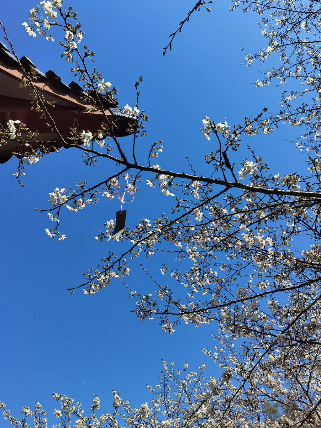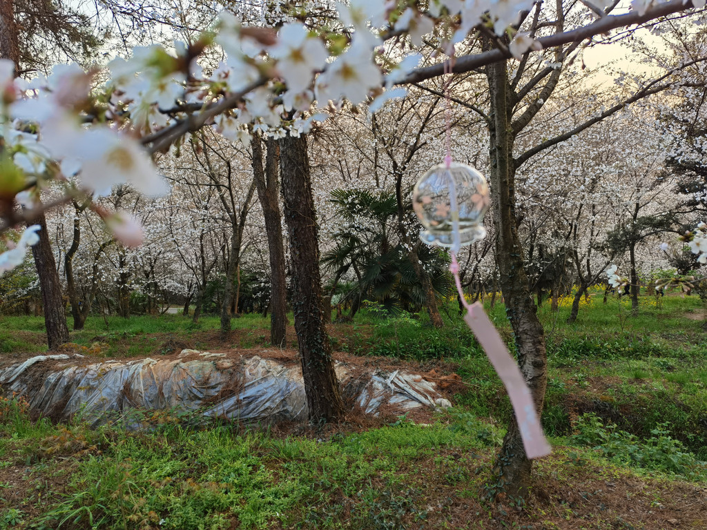 赏樱阁周边的樱花树上挂满了风铃,被风吹得叮叮当当响,更增添了一份情景。