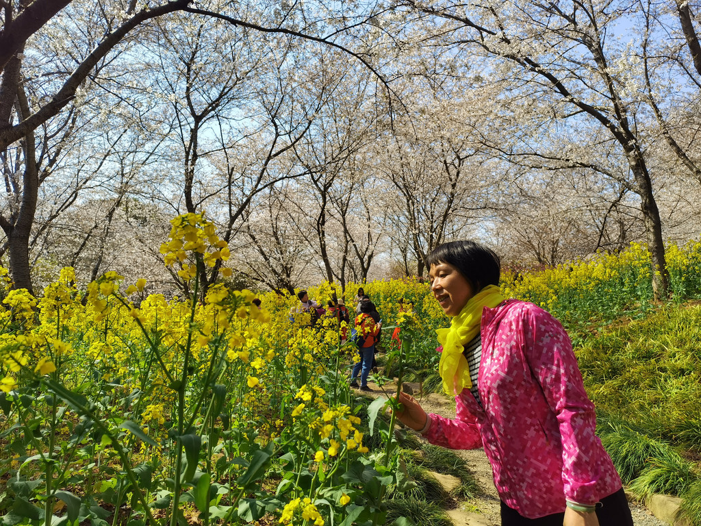 十里花径两边的山坡上,种了一片片的油菜花和紫色的小花,与红白粉等颜色樱花交集在一起,显得更加娇艳。