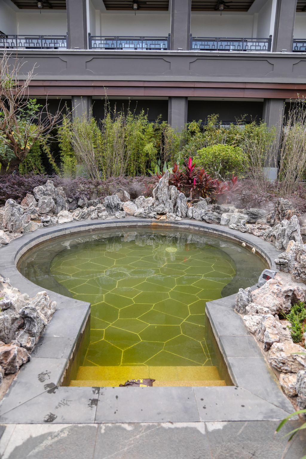在大堂的露台,还能看到公共温泉区的风景。假山和树木遮挡了部分园区的景致,加上弥漫的烟雾,更有一种犹抱琵琶半遮面的期待。