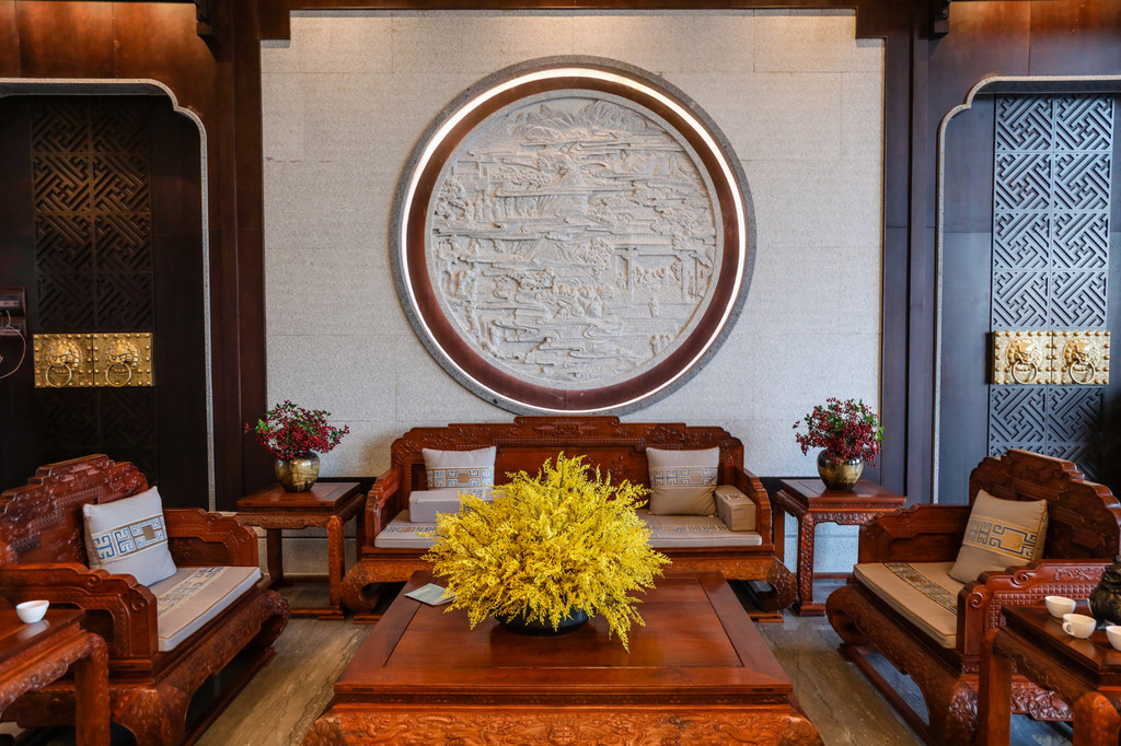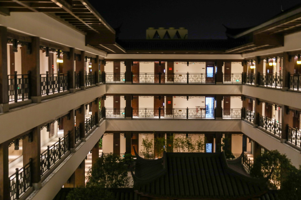 走入酒店首先看到的是一条长廊。长廊是典型的园林风格,柱子上的雕塑,瓦片上的花纹,都是典型的 江南 风格。甫一进入酒店,就已经感受到 江南 园林的温婉与美好。