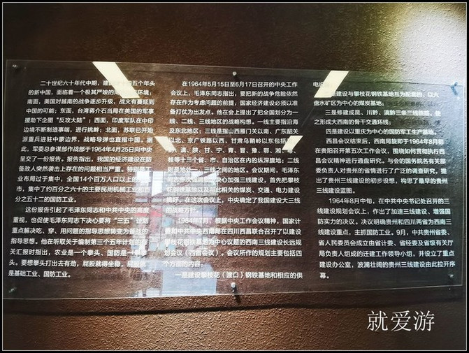 贵州三线建设博物馆从1964年开始,中央决定建设第二套完整的国防工业和重工业体系,将国防、科技、工业、交通等生产资源逐步迁入三线地区。从1964年至1980年,贯穿三个五年计划的16年中,国家在属于三线地区的13个省和自治区的中西部投入了占同期全国基本建设总投资40%左右的2052.68亿元巨资;400万工人、干部、知识分子、解放军官兵和成千万人次的民工,在毛主席备战备荒为人民、好人好马上三线的号召下,打起背包,跋山涉水,来到祖国大西南、大 西北 的深山峡谷、大漠荒野,风餐露宿、肩扛人挑,用艰辛、血汗和生命,建起了1100多个大中型工矿企业、科研单位和大专院校。为大西南打下了坚实的工业基础,改变了大西南的面貌。