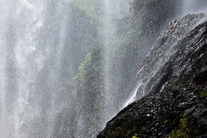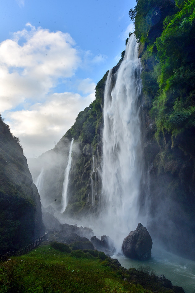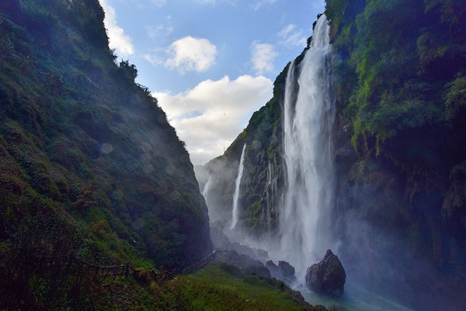 站在谷底,瀑布从天而降,就像一条白色的飘带,从空中撒下来,飘飘渺渺,小小的水珠随风飘扬,还时不时飘落在身上。