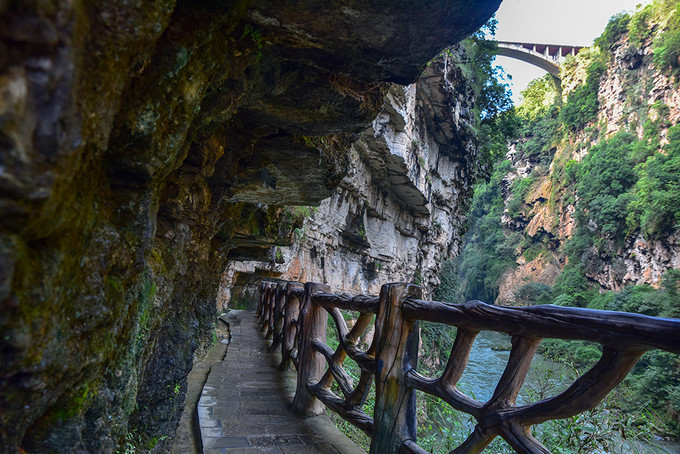 沿途峡谷深幽,栈道攀崖而行,曲曲折折, 引人入胜,沿道而游,如进画中,一步一景,步移景异,令人流连忘返。