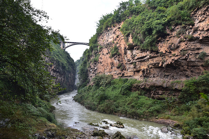 沿着峡谷栈道走,路的一边就是石壁,另一边则是落差几十米的河流,给人的感觉是在探险,一路上,时蹲、时爬、时俯、时仰,好不惊险。