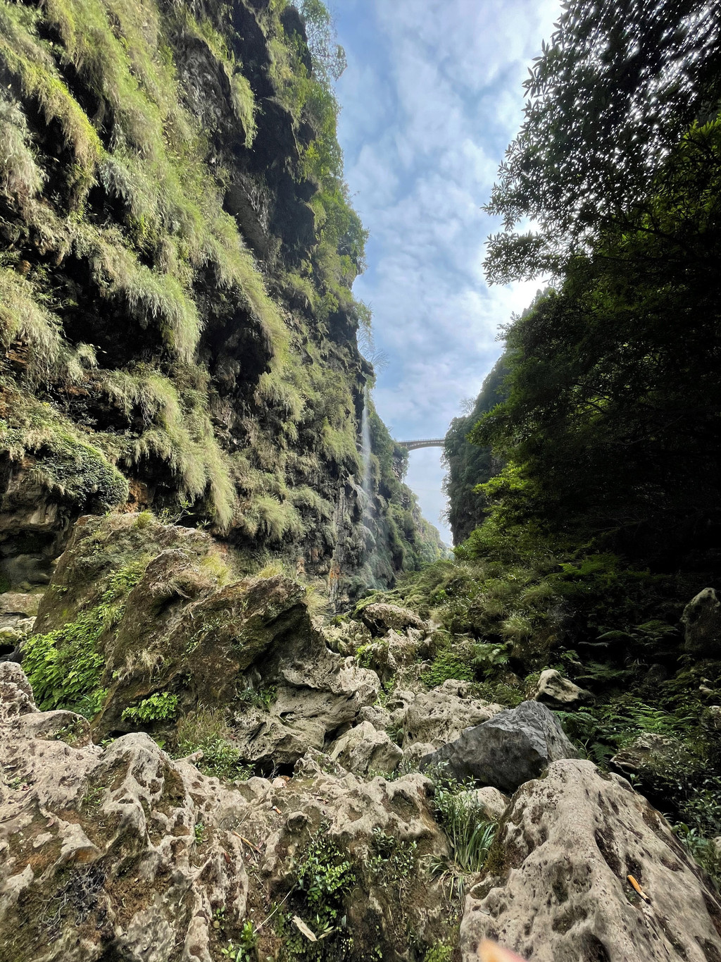 整个景区的瀑布很多,东侧崖壁大大小小好几处瀑布,走到万马奔腾景观,形成了瀑布群,虽然不是水量大的季节,但还是很有声势,大大小小的瀑布奔腾而下,在空气中结成水汽,迎面扑来,还是谓之窒息!
