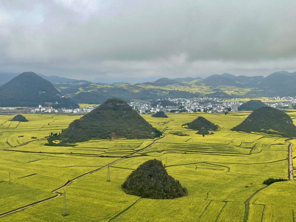 罗平油菜花是指云南省曲靖市罗平县一种美丽而蔚为壮观的人造景观,这已经是每年春天云南旅游亮点之一。罗平的金鸡峰是观赏油菜花海的一个景点,这里是喀斯特地貌的山峰,配合地面上金黄色的万亩菜花田,形成了层层叠叠富有层次的花海,这就是罗平花海的基本肖像。