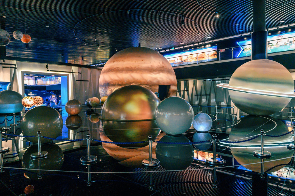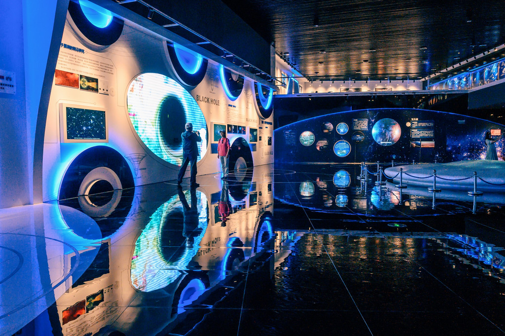 天文体验馆一共有2层,分为序厅、天象厅、射电体验厅、儿童天文园和天文科普厅五个展厅,另外体验馆内还有天文5D视频厅、天文地质模拟体验区、数码星象厅等,并融入了声光技术,营造出来的氛围感十分科幻,让人有一种置身于星空的感觉。