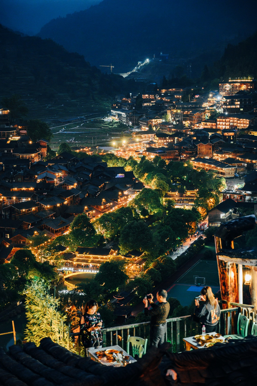 趁着天还没有全黑,我们前往1号桥那里乘坐车子去观景台,观景台上已经围满了游客,黄昏时慢慢的看着千家万户亮起了灯火,此时的西江千户苗寨仿若灯的海洋,人间烟火气莫过于此,站在高处俯瞰万家灯火,眼前的画面让人激动,又让人瞬间归于平静,古老的文化、建筑、风俗在这里延续着,流传至今。