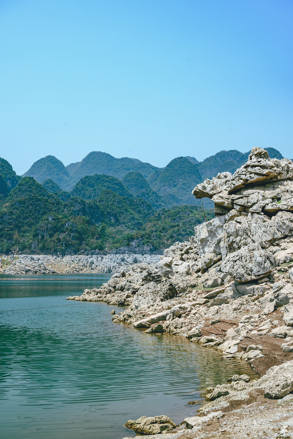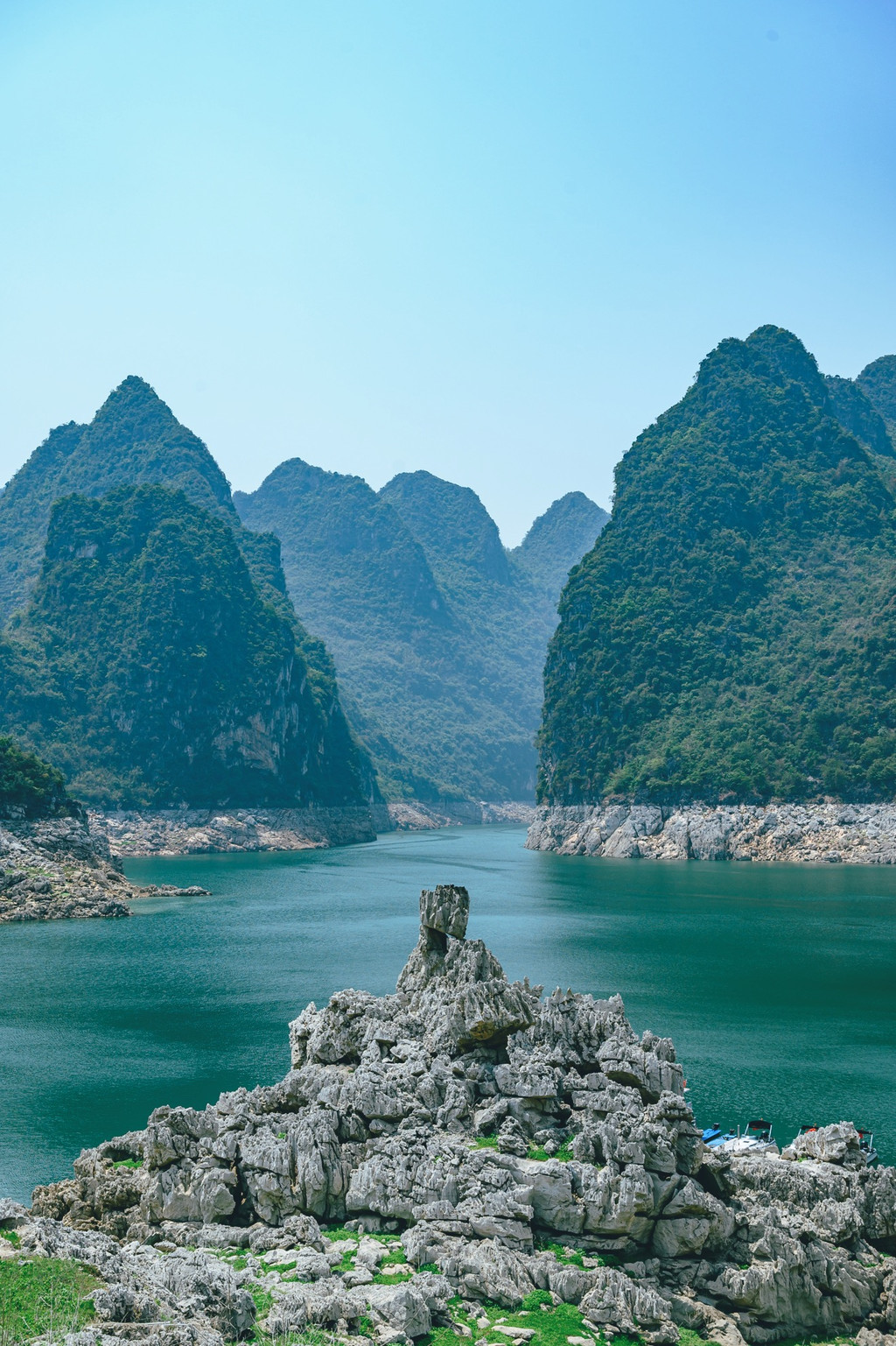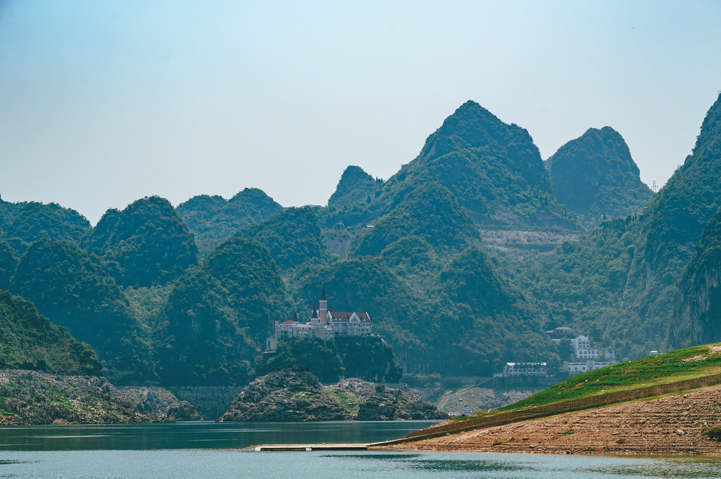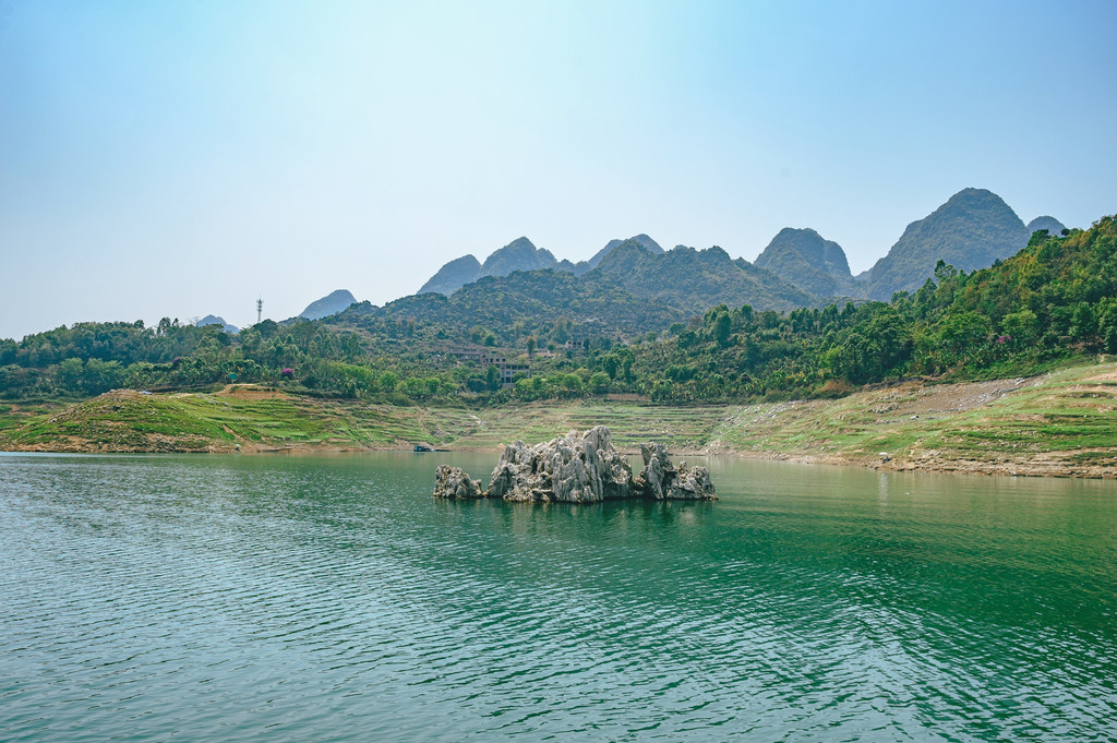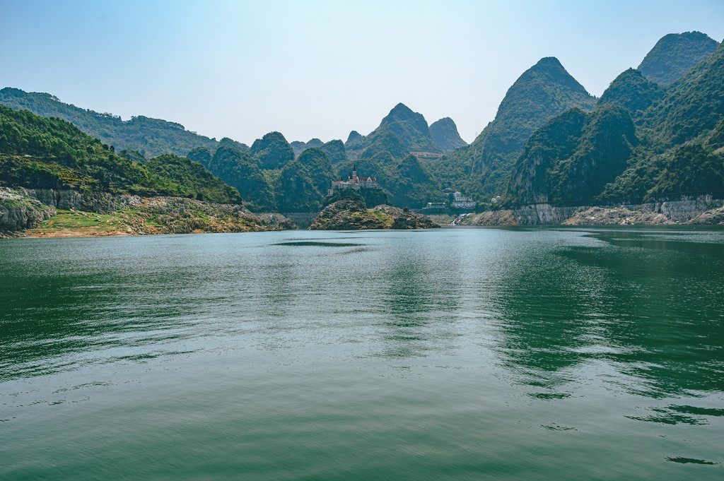 从万峰林出发,翻过一座座山,转过一道道弯,经过将近一个小时的盘山公路,抵达了万峰湖,远远的看见掩映在崇山峻岭间的万峰湖,好似镶嵌在众多高山之中的一颗翠绿的宝石。