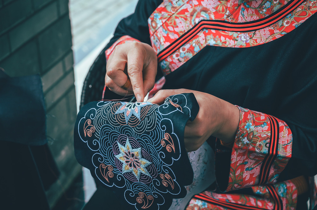 水族马尾绣是水族妇女世代传承的最古老又最具民族特色的一种刺绣技艺,被称为中国刺绣“活化石”,马尾绣与普通刺绣不同,制作过程繁琐复杂,首先要用白线将3-5根马尾缠成马尾线,然后再在盘绣成图案轮廓,再按照构图,将各色马尾线填心,制成精美的图案。