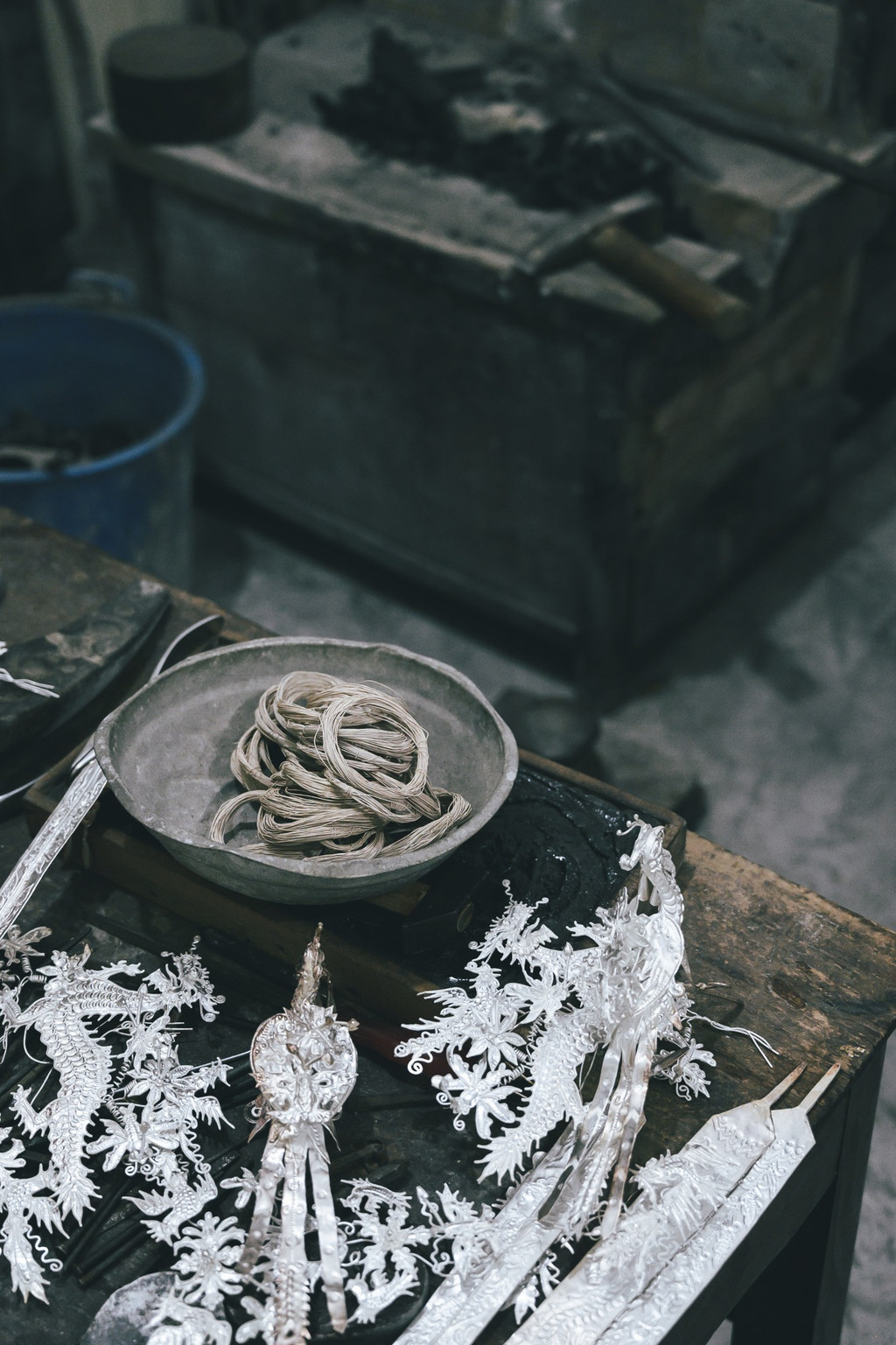 走进吴老师的工作室,放满了制作银饰所需要的工具,虽然东西很多,空间很小,但所有的工具井然有序,一目了然,桌子上还摆放着他已经制作好的银饰和学徒制作的残次品。
