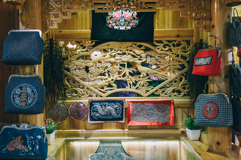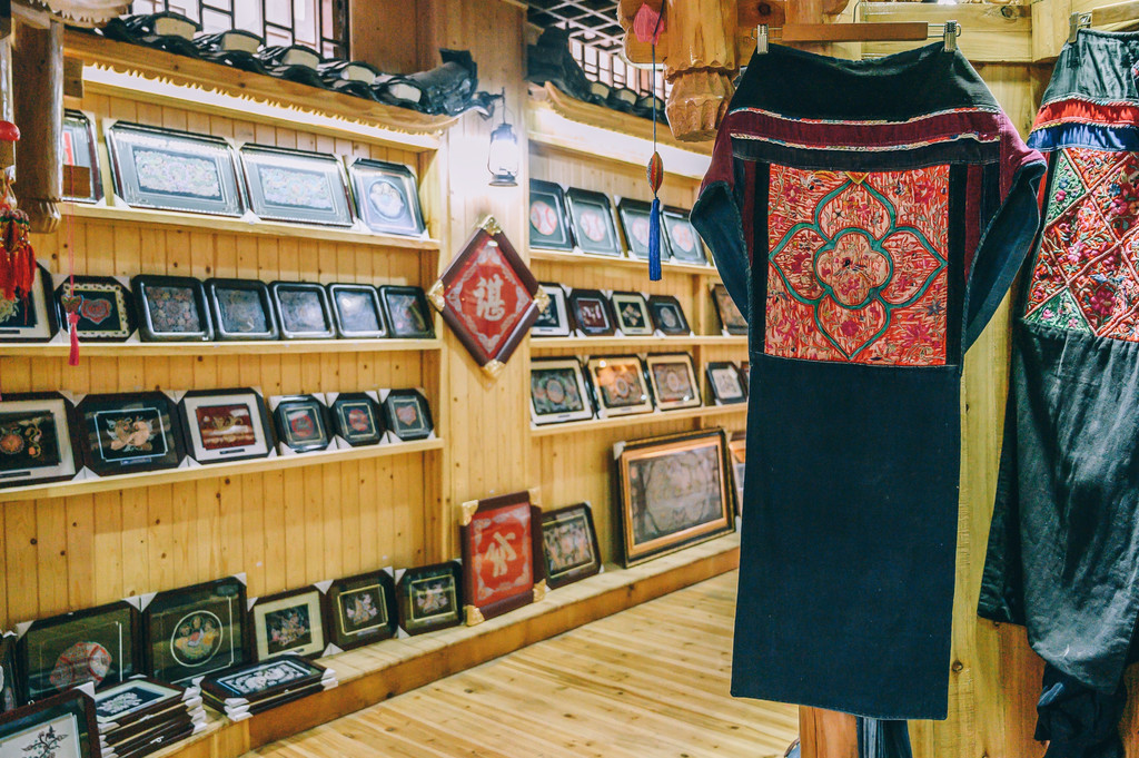 这里的银饰也是历史悠久,享誉中外,工艺精湛,堪称“无字史书”,具有极高的文化品位。精美绝伦的苗族服饰,更是有着“写在身上的历史”之称。尽管现在走在街巷看不到游人穿着盛装,但仔细查看,还是会看到基本上在每个人的身上都会到有刺绣的单品存在。
