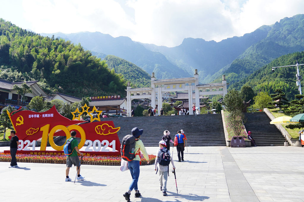 进入景区检票后,乘坐免费转运车到达石鼓寺,如有老人小朋友,建议乘坐一级索道(中庵索道),10分钟后到达中庵紫极宫。