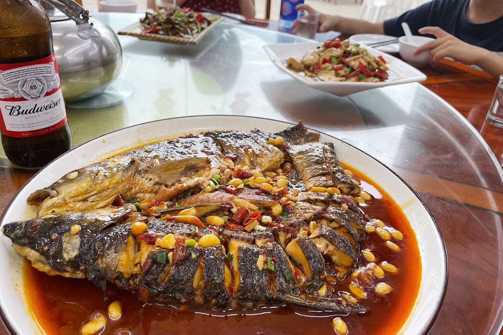 酒店对面有很多农家菜,可步行出去解决晚餐,这道黄豆烧鱼还蛮赞的。