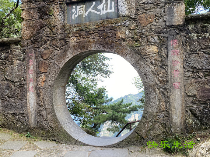 仙人洞入口处的圆拱门,进门后是一棵苍松,虽根茎裸露,但傲然挺立。