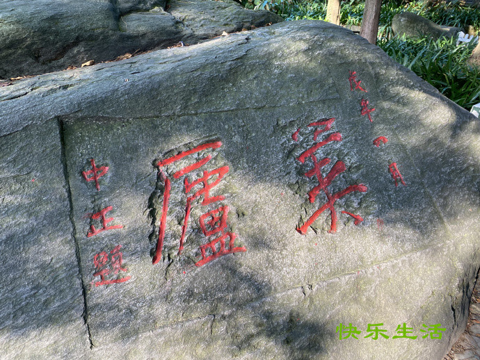 红色的花径亭里的“花径”二字,相传是白居易的亲笔手书。