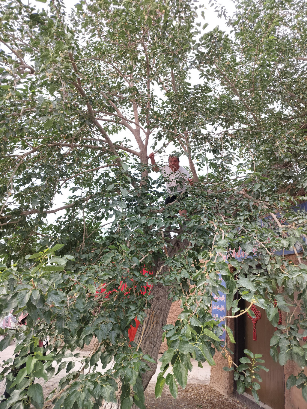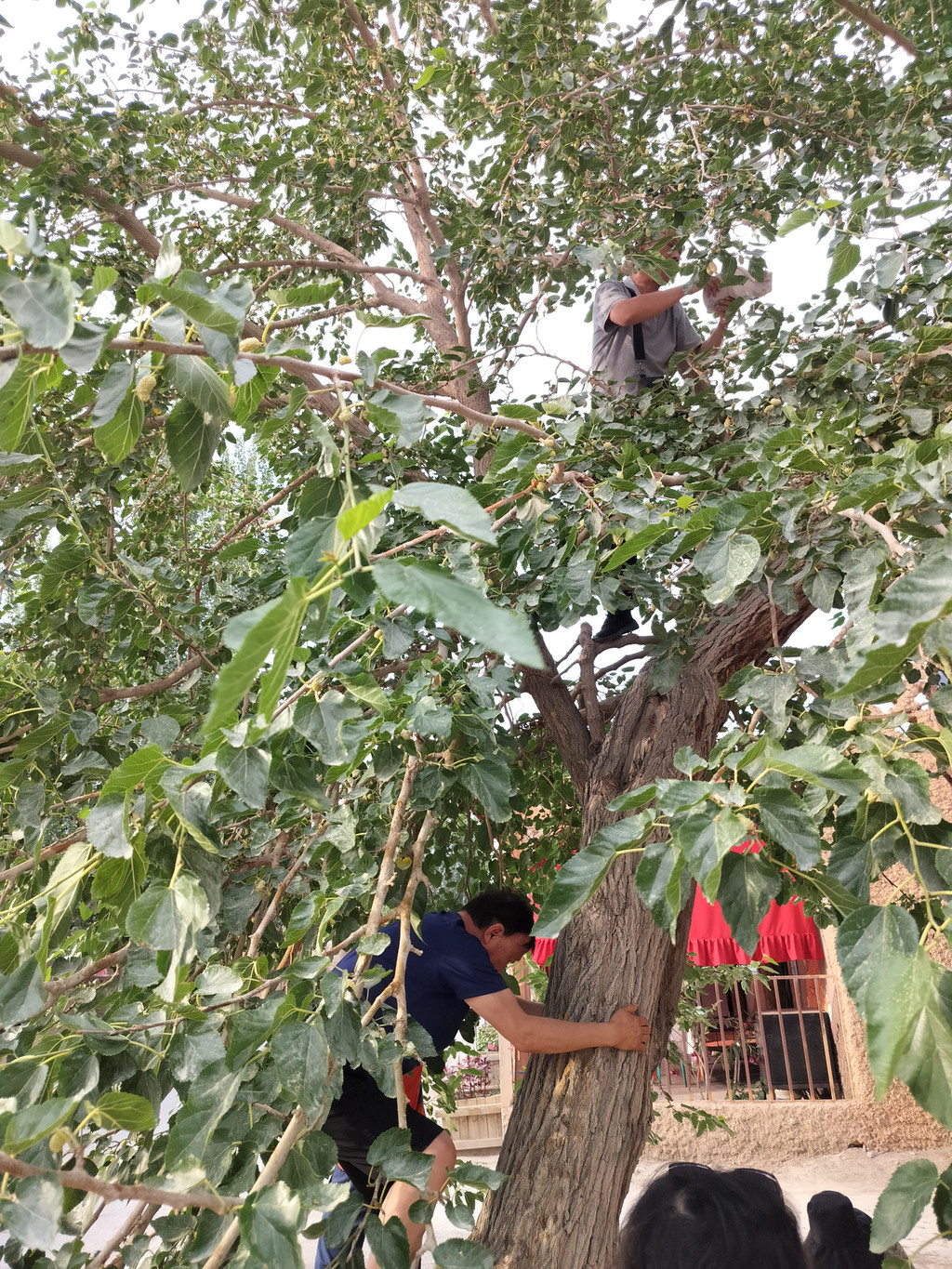 葚子真甜,边摘边吃,丁哥又爬树了,捡起晃落在地下的葚子塞在嘴里吃,甜中带有一股羊粪味,树下曾有羊经过,留下了排泄物,可大家仍吃的不亦乐乎。路边的小白杏看上去不熟,摘一个放进嘴里,真好吃。一会,村民赶来,心平气和地说不可随便摘,丁哥递了一支烟,又可让摘了。市面上一公斤卖20元呢,我摘了有半公斤。丁哥说,维族人大方的很,没事的。