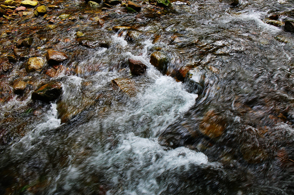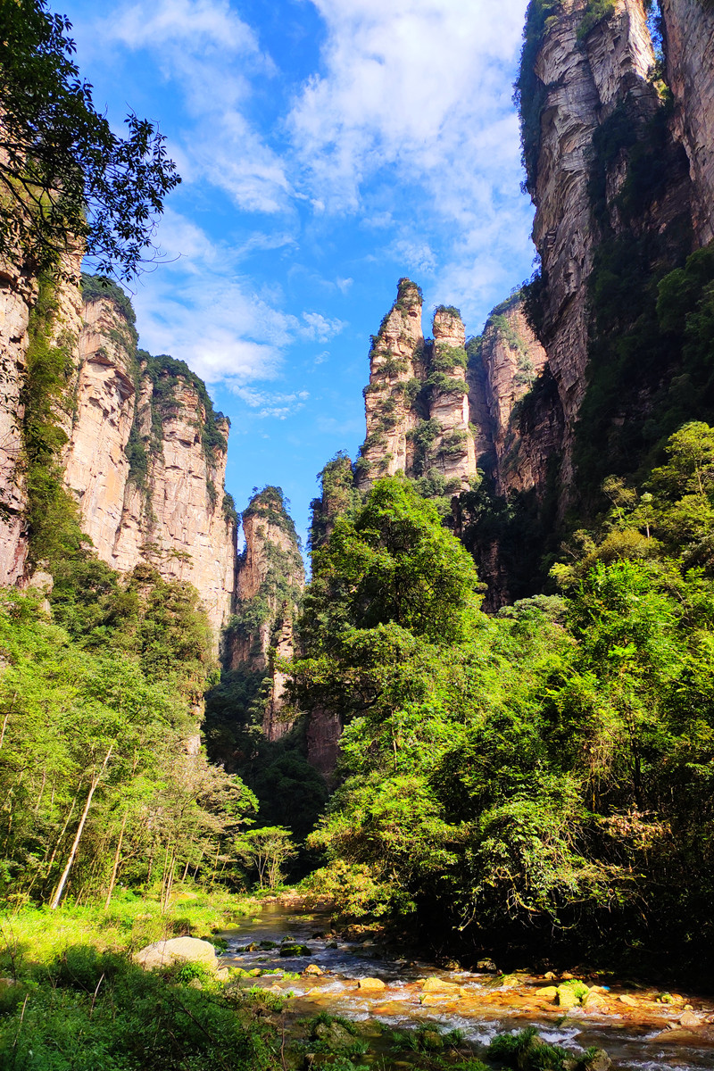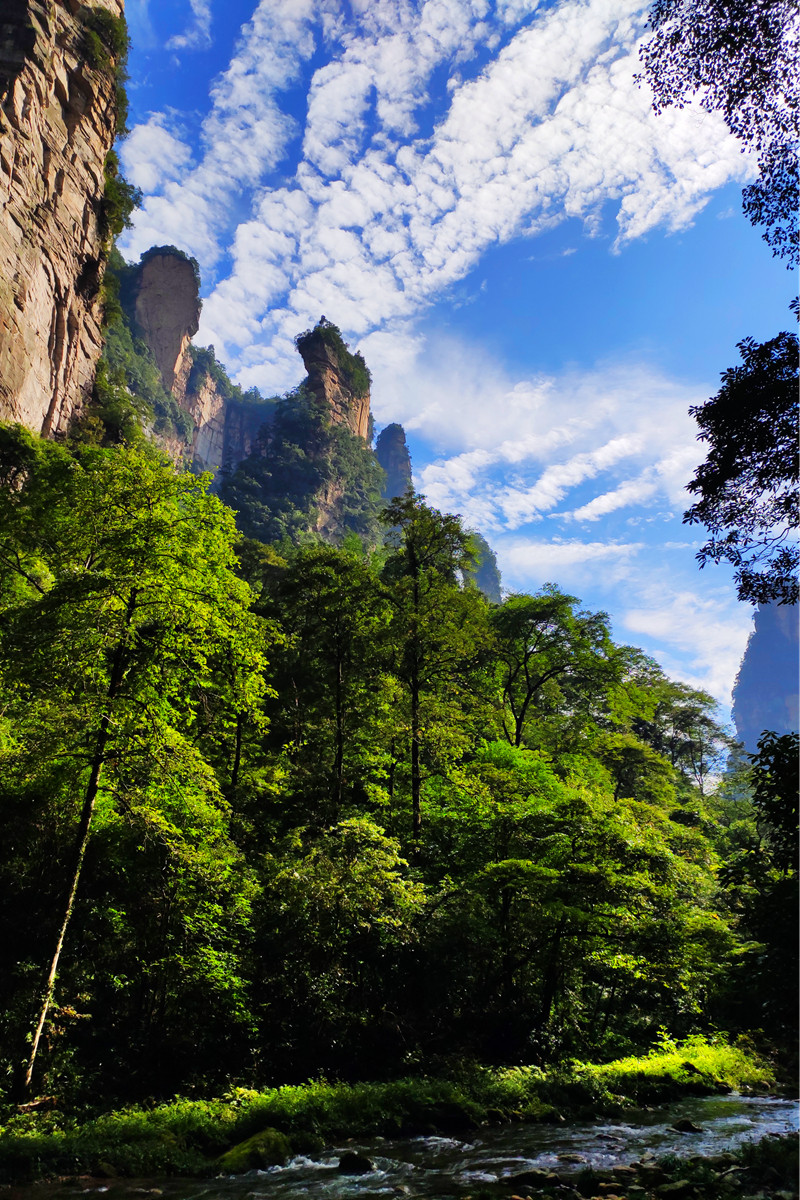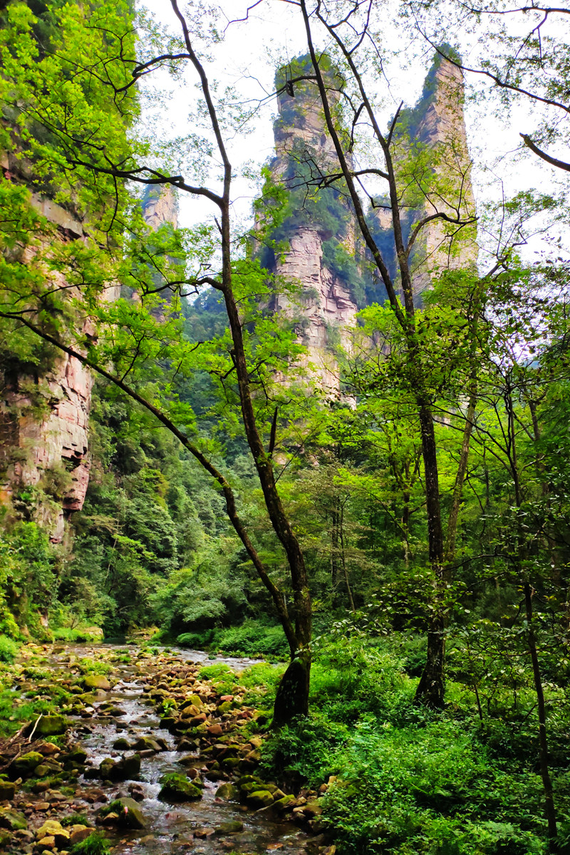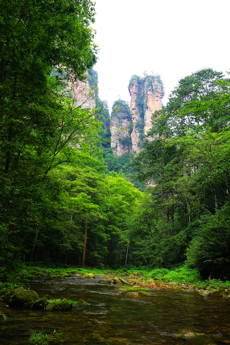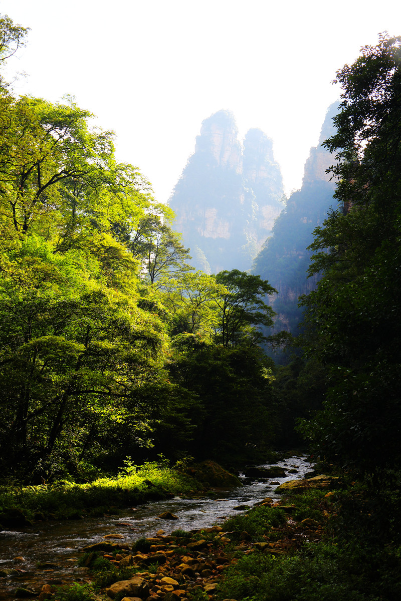 金鞭溪全长大约6公里,蜿转曲折,随山而移,幽静异常,穿行在峰峦幽谷之间,流水潺潺,清澈见底、纤尘不染的碧水中,能够看见许多鱼儿欢快地游动。溪水两岸全部是高高耸立的柱状山峰,这些山峰被人为赋予了名字及传说,我们无心过问,也实在欣赏不了,因为周围的树木阴翳蔽日,只留下了断断续续的小部分空隙。行走在这号称“山水画廊”、“人间仙境”的地方,只需要静心感受那份难得的宁静和闲适。