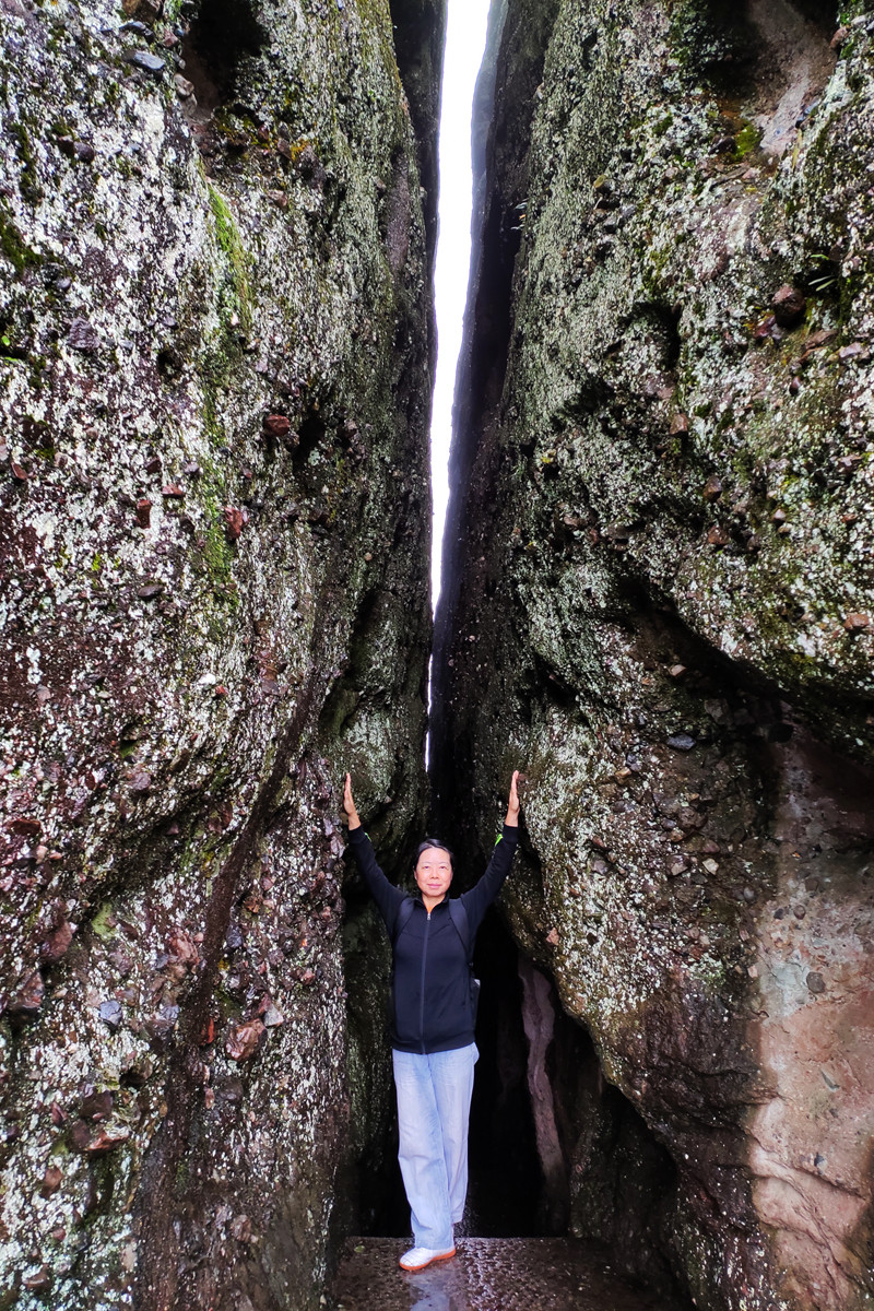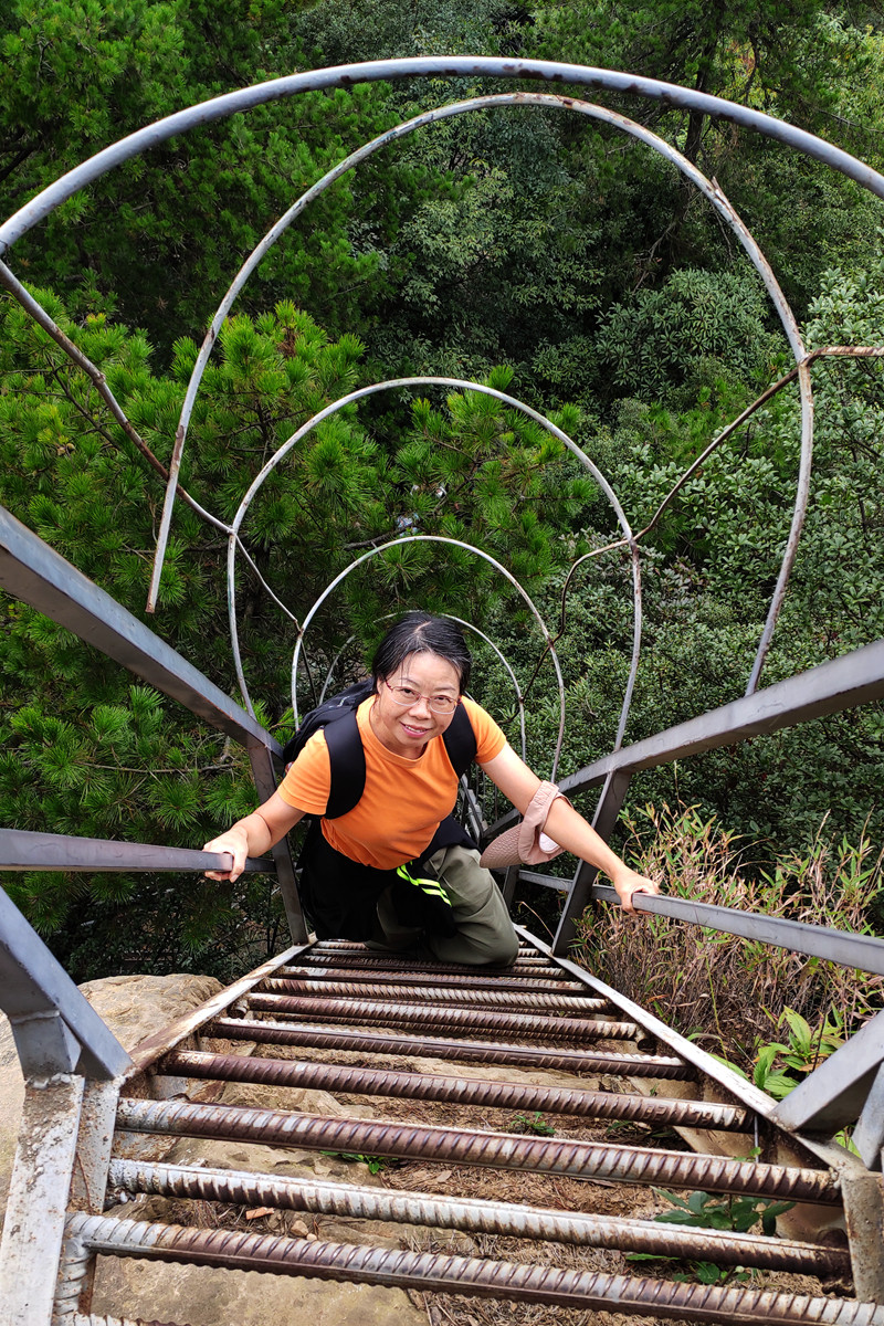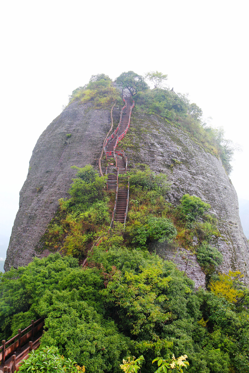 一步登天,从32步陡峭的铁梯登上峰顶,如同一步登天,踏上仙境,峰顶平坦,环顾四周,奇峰怪石,前方可看见一石峰旁矗立一小峰,上大下小,似一棒槌。