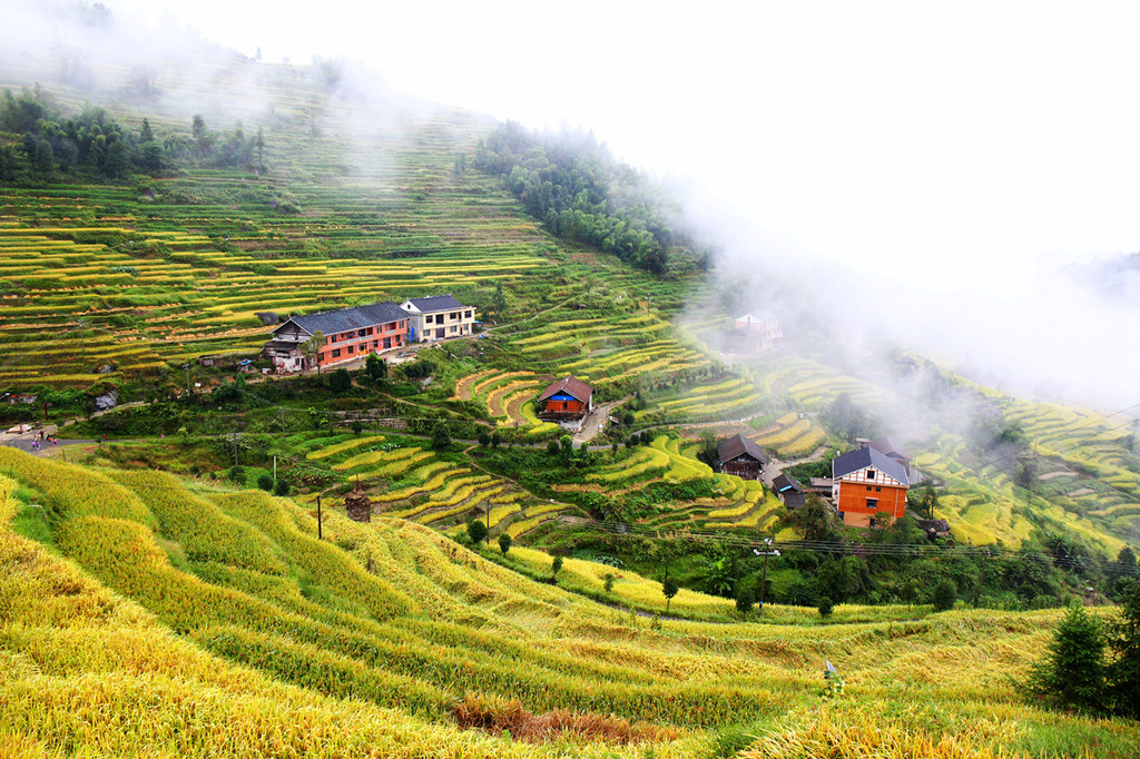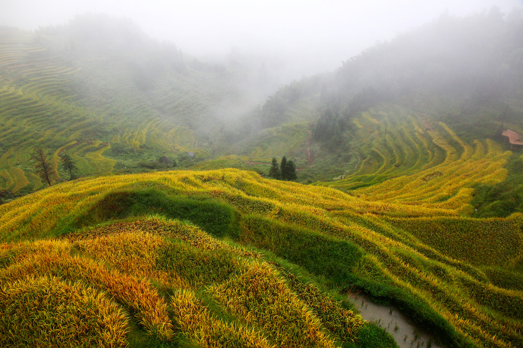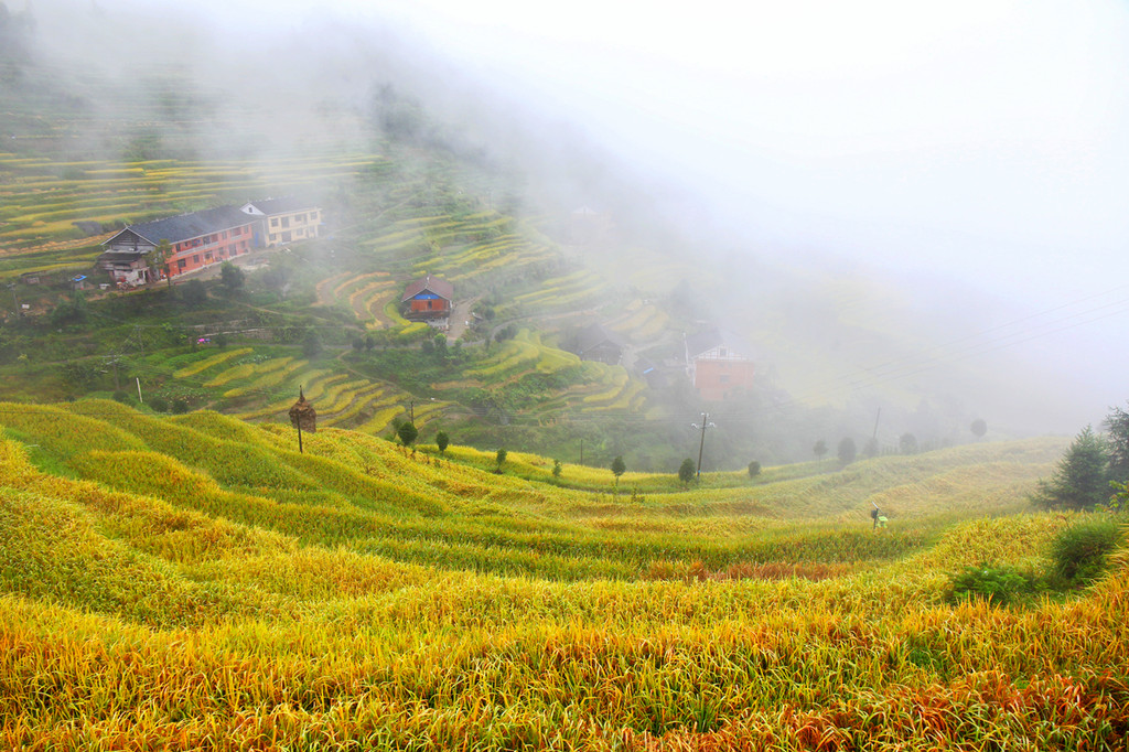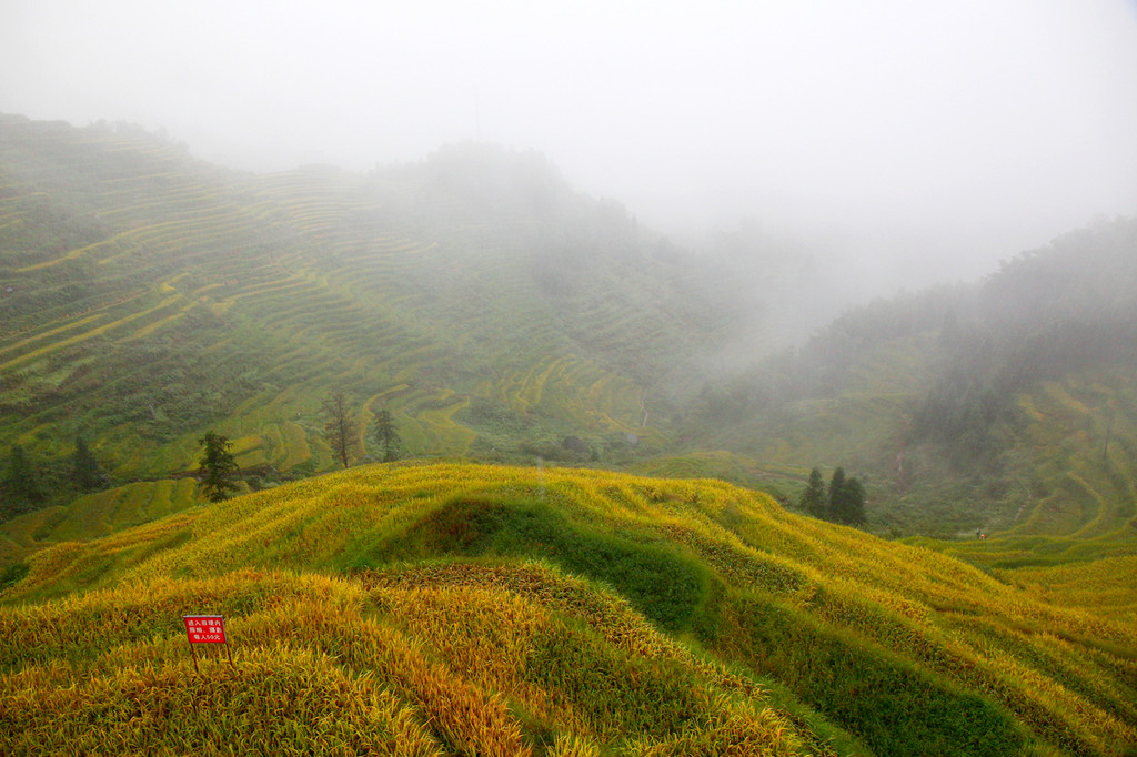 从紫鹊界景区大门验票后,我们开车一路爬坡,来到了月牙山观景台。临近傍晚,天色微暗,周围雾气蒙蒙,细雨霏霏。站在观景台上极目远眺,远处迷茫一片,俯瞰近处身下,如弯月似长带的梯田影影绰绰,变化万千,满眼望去金黄一片,据说梯田最美的时间是4、5月灌水插秧的时节和9、10月稻穗成熟的时候,我们来的正是时候。