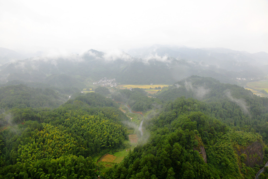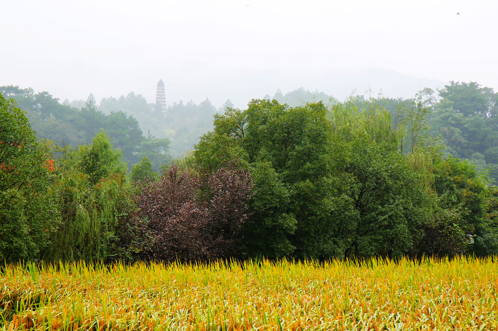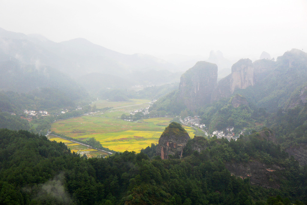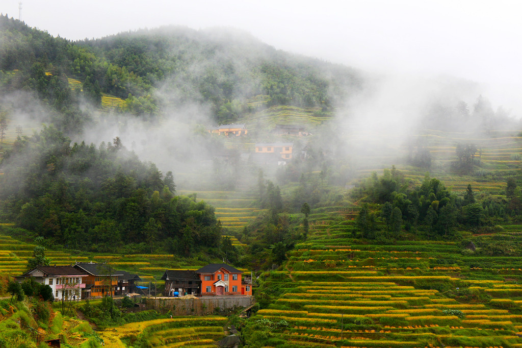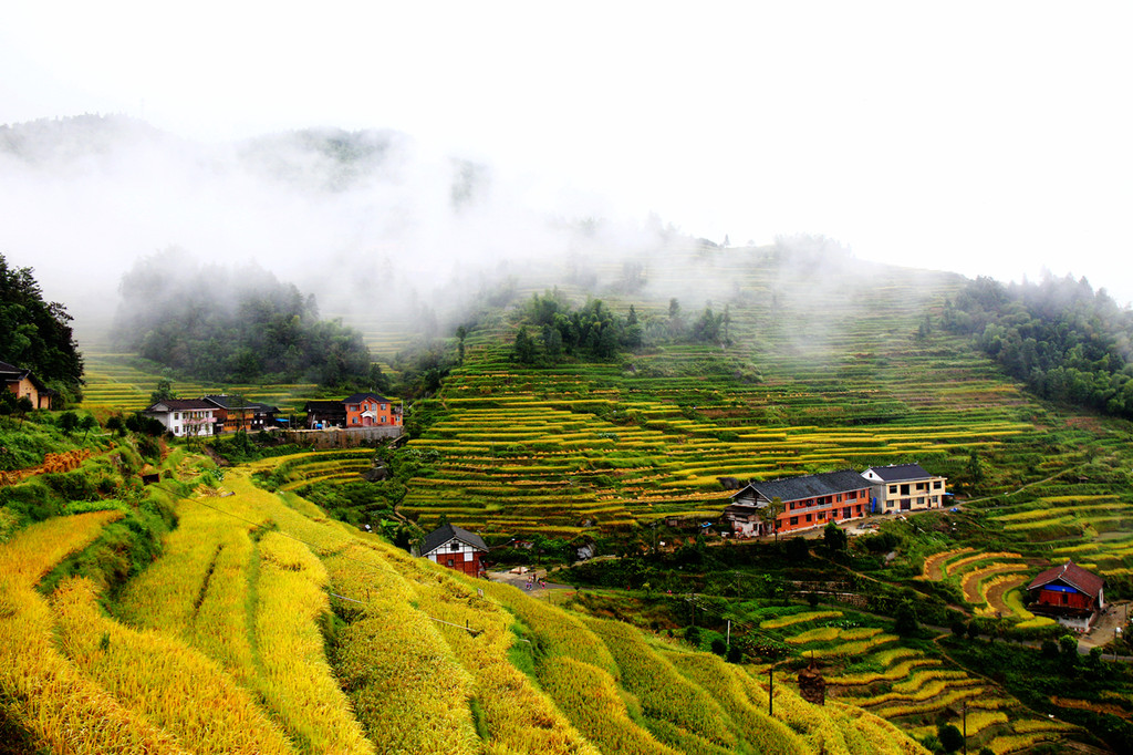 从紫鹊界景区大门验票后,我们开车一路爬坡,来到了月牙山观景台。临近傍晚,天色微暗,周围雾气蒙蒙,细雨霏霏。站在观景台上极目远眺,远处迷茫一片,俯瞰近处身下,如弯月似长带的梯田影影绰绰,变化万千,满眼望去金黄一片,据说梯田最美的时间是4、5月灌水插秧的时节和9、10月稻穗成熟的时候,我们来的正是时候。